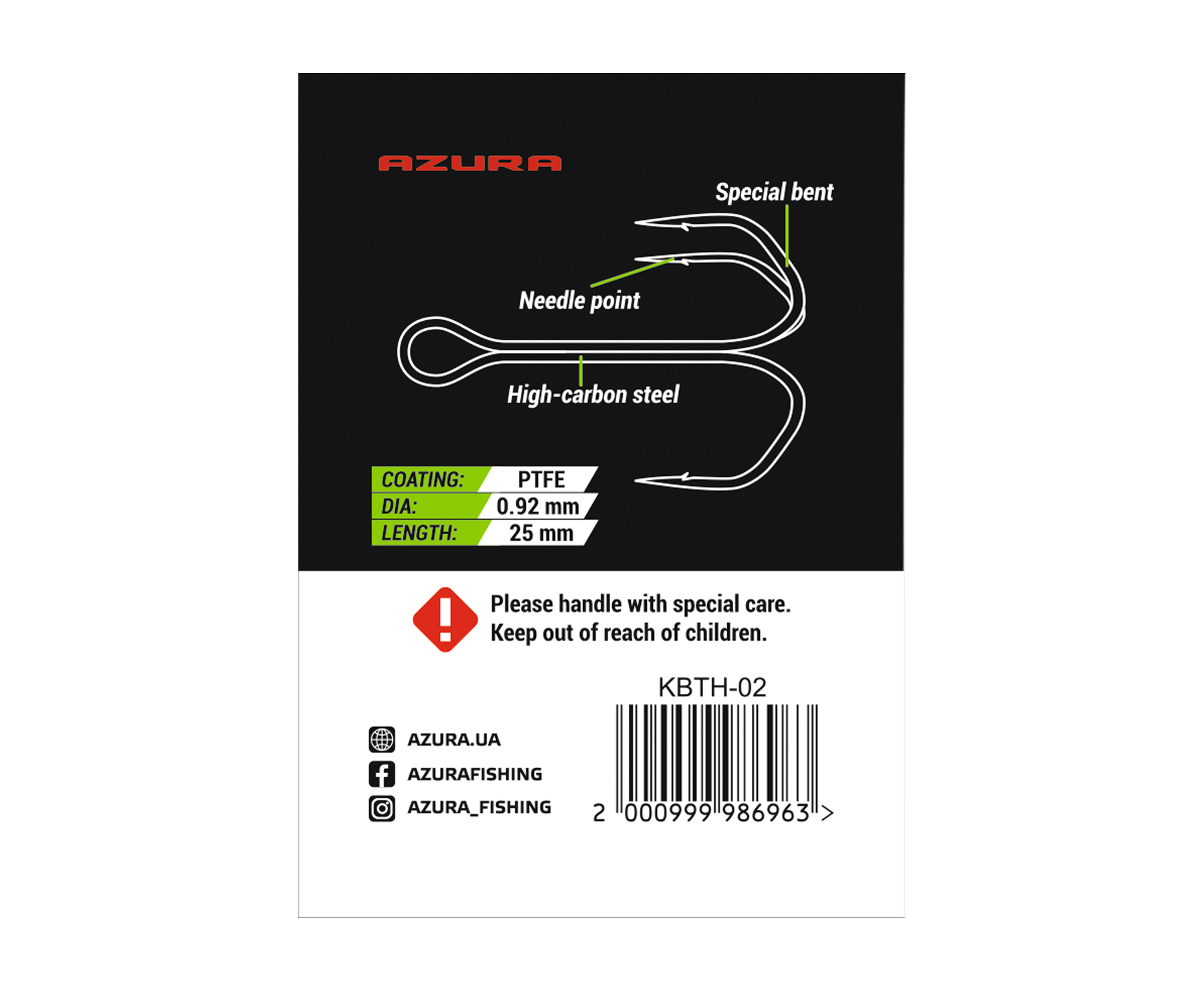 Azura Kenshin Barb Treble Hook special bent – серія високоякісних потрійних гачків із великим вушком і спеціальною формою вигину, які рекомендовано використовувати для додаткового обладнання шарнірних монтажів, оснащення воблерів, блешень тощо. Гачки виготовлено з високовуглецевого сталевого дроту. Вони мають високу надійність, а також, завдяки спеціальній формі вигину, підвищену міцність на розгинання. Для гачків Azura Kenshin Barb Treble Hook special bent характерні укорочена цівка, широкий хижий піддiв спеціальної форми, надгостре жало із заточуванням Needle Point, що гарантує надійне засікання риби, акуратна чіпка борідка та високоякісне антикорозійне покриття PTFE, що значно покращує проникаючу здатність гачків. Розмірний ряд Azura Kenshin Barb Treble Hook дає змогу підібрати оптимальний за розміром гачок практично під будь-яку приманку.
