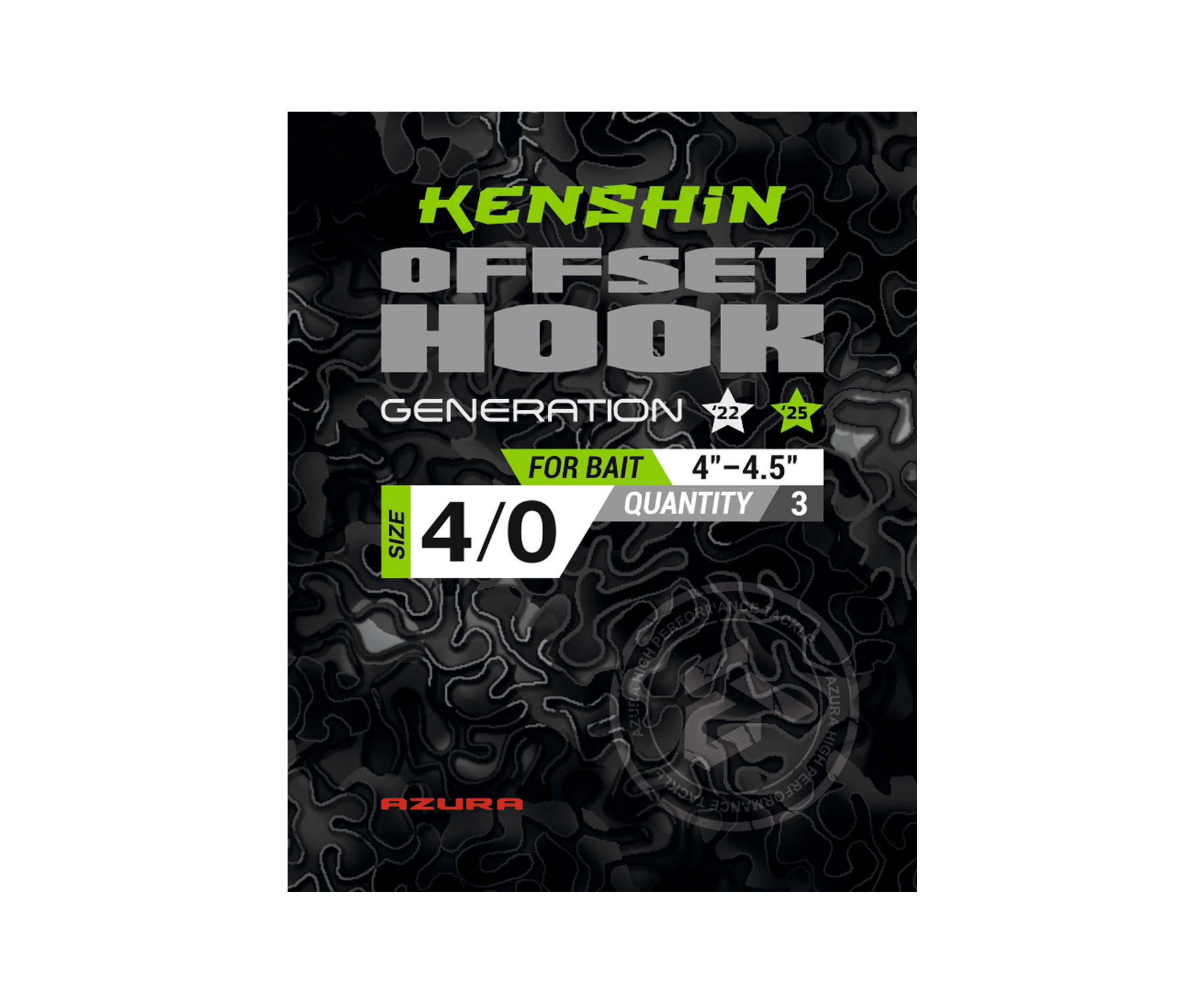Azura Kenshin ll Offset Hook – серія високоякісних офсетних гачків, розроблених для використання, перш за все, у шарнірних монтажах. Головною відмінністю цих гачків є кільце збільшеного діаметра, завдяки якому забезпечується повна свобода рухів приманки під час проведення. Такий розмір кільця дає змогу використовувати не тільки «вухаті» грузила зі знімними рамами, але і звичайні завідні кільця – для з'єднання гачка з грузилом. Гачки Azura Kenshin ll Offset Hook виготовлені з високовуглецевого сталевого дроту та характеризуються стандартної довжини цівкою, широким вигином класичної форми, кованим піддівом, надгострим жалом із заточуванням Needle Point, акуратною чіпкою борідкою та високоякісним антикорозійним покриттям PTFE, що значно покращує проникаючі властивості гачка. Офсетні гачки Azura Kenshin ll ідеально підходять для оснащення переважної більшості м'яких пластикових приманок різних форм. Широкий розмірний ряд Kenshin ll Offset Hook дає змогу підібрати оптимальний за розміром гачок практично під будь-яку м'яку приманку з розмірами від 1 до 5 дюймів.