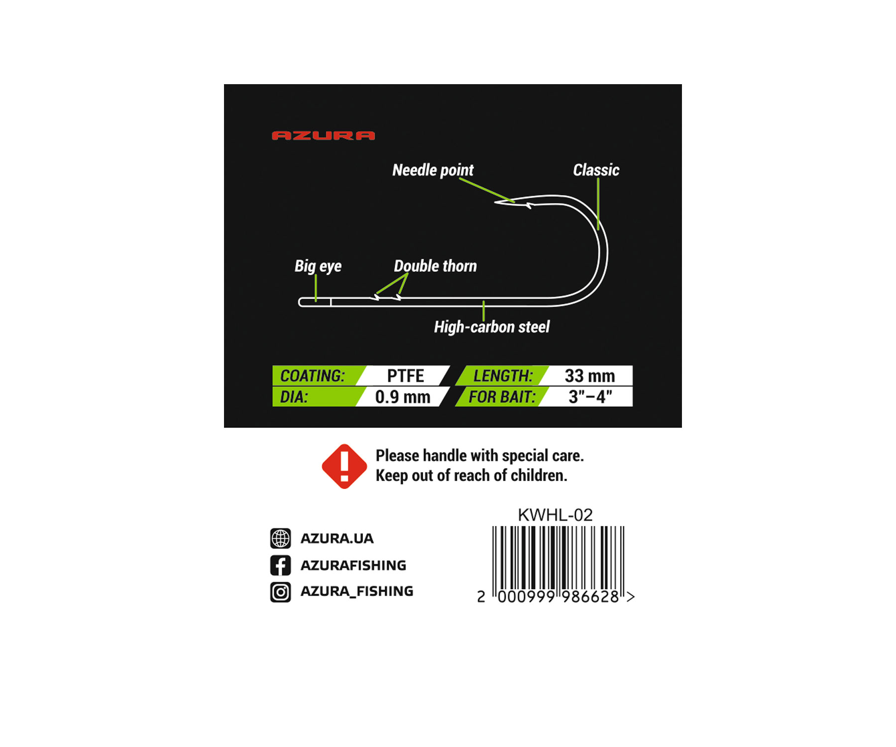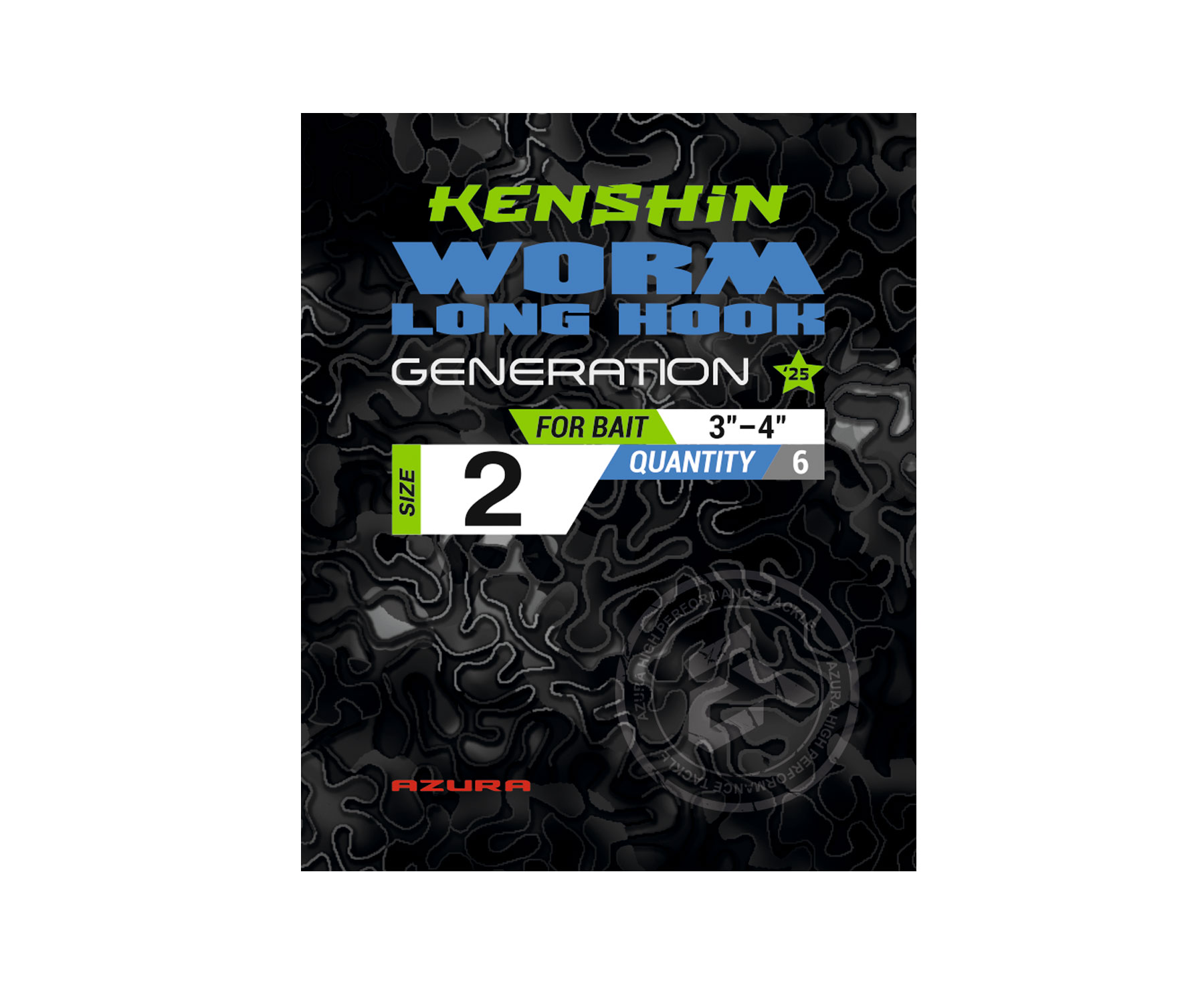 Azura Kenshin Worm Hook long – серія високоякісних одинарних гачків зі збільшеним вушком і класичною формою вигину, які призначено для використання в шарнірних та інших спінінгових монтажах. Гачки Azura Kenshin Worm Hook long ідеально поєднуються з більшістю м'яких пластикових приманок будь-яких форм. Гачки виготовлено з високовуглецевого сталевого дроту. Вони мають високу надійність, а також високу міцність на розгинання. Azura Kenshin Worm Hook long мають довгу цівку, кований піддів округлої форми, надгостре жало із заточкою Needle Point, що гарантує надійне засікання риби, акуратну чіпку борідку та високоякісне антикорозійне покриття PTFE, що значно покращує проникаючу здатність гачка. Крім того, дві спеціальні борідки на внутрішній стороні цівки сприяють кращому утриманню приманки під час закидань та клювань риби. Широкий розмірний ряд Azura Kenshin Worm Hook long дає змогу підібрати оптимальний за розміром гачок практично під будь-яку м'яку приманку від 0,8" до 4,5".