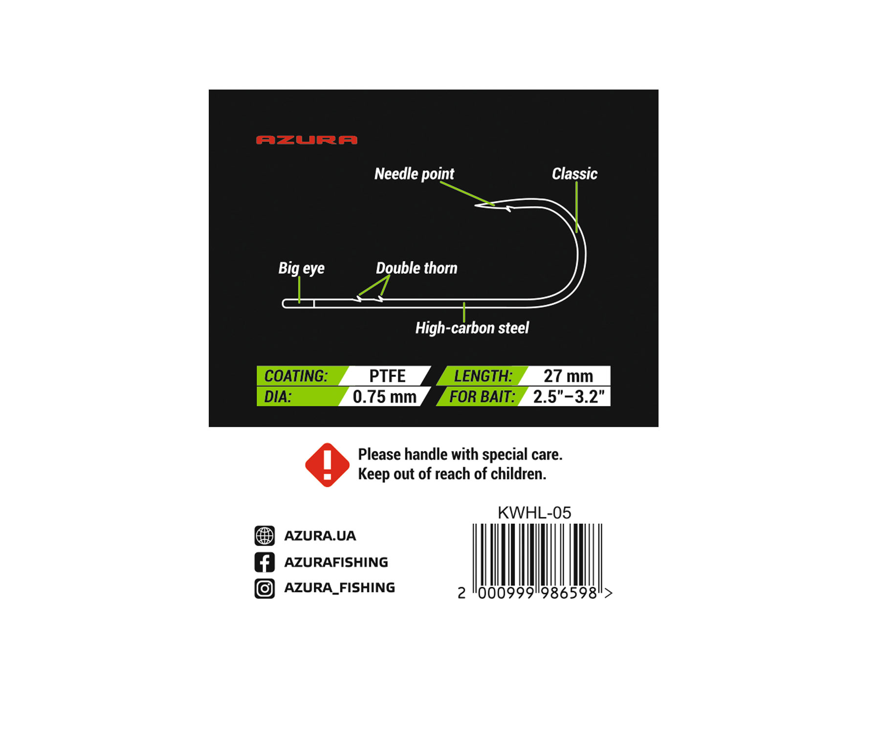 Azura Kenshin Worm Hook long – серія високоякісних одинарних гачків зі збільшеним вушком і класичною формою вигину, які призначено для використання в шарнірних та інших спінінгових монтажах. Гачки Azura Kenshin Worm Hook long ідеально поєднуються з більшістю м'яких пластикових приманок будь-яких форм. Гачки виготовлено з високовуглецевого сталевого дроту. Вони мають високу надійність, а також високу міцність на розгинання. Azura Kenshin Worm Hook long мають довгу цівку, кований піддів округлої форми, надгостре жало із заточкою Needle Point, що гарантує надійне засікання риби, акуратну чіпку борідку та високоякісне антикорозійне покриття PTFE, що значно покращує проникаючу здатність гачка. Крім того, дві спеціальні борідки на внутрішній стороні цівки сприяють кращому утриманню приманки під час закидань та клювань риби. Широкий розмірний ряд Azura Kenshin Worm Hook long дає змогу підібрати оптимальний за розміром гачок практично під будь-яку м'яку приманку від 0,8" до 4,5".