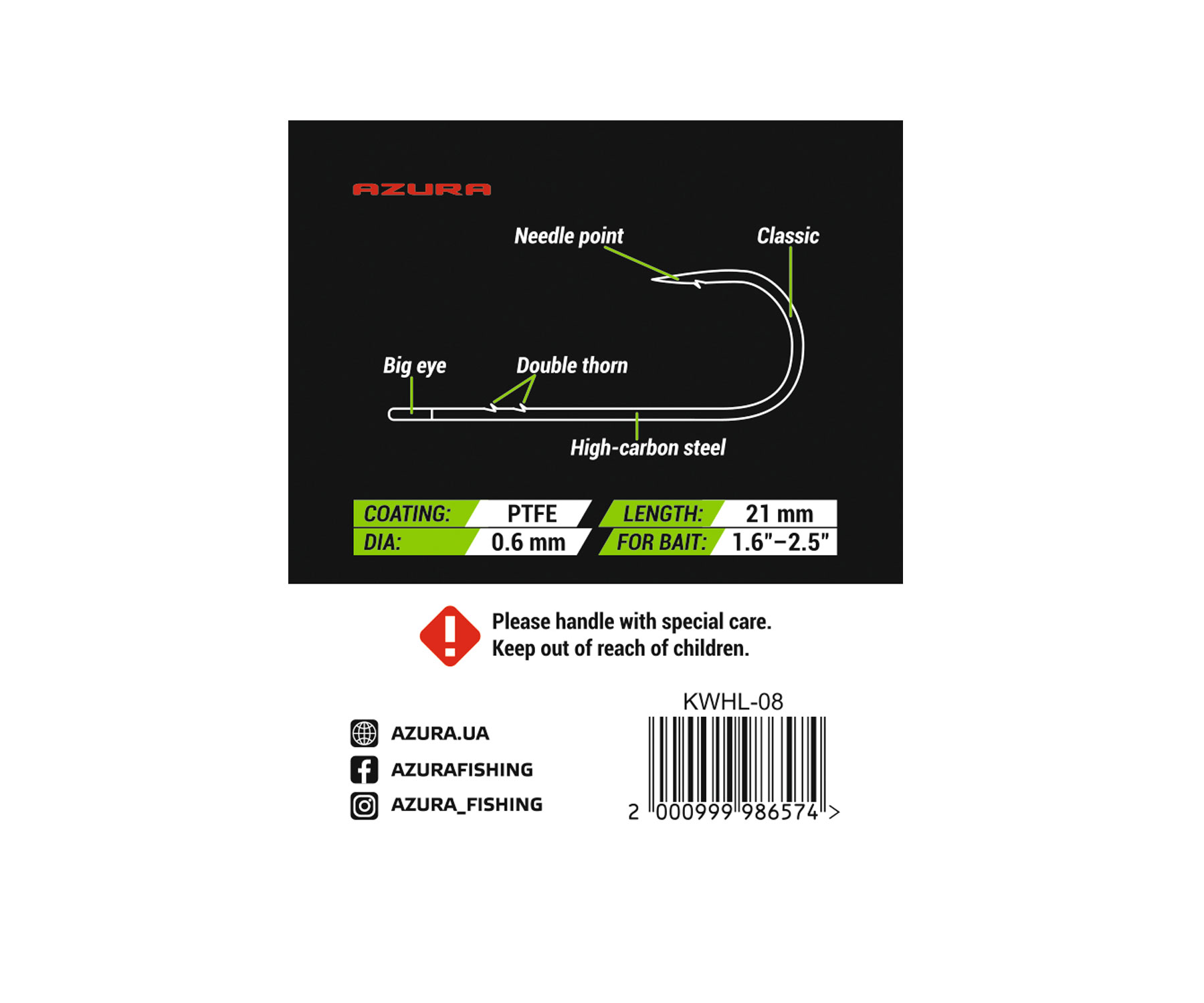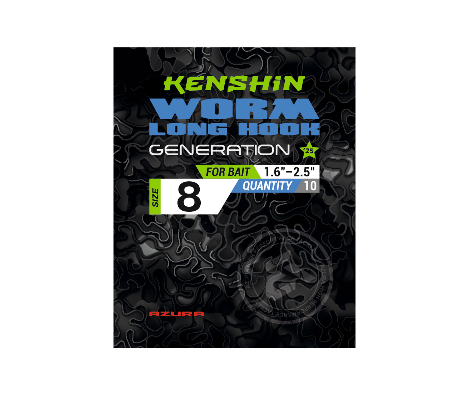 Azura Kenshin Worm Hook long – серія високоякісних одинарних гачків зі збільшеним вушком і класичною формою вигину, які призначено для використання в шарнірних та інших спінінгових монтажах. Гачки Azura Kenshin Worm Hook long ідеально поєднуються з більшістю м'яких пластикових приманок будь-яких форм. Гачки виготовлено з високовуглецевого сталевого дроту. Вони мають високу надійність, а також високу міцність на розгинання. Azura Kenshin Worm Hook long мають довгу цівку, кований піддів округлої форми, надгостре жало із заточкою Needle Point, що гарантує надійне засікання риби, акуратну чіпку борідку та високоякісне антикорозійне покриття PTFE, що значно покращує проникаючу здатність гачка. Крім того, дві спеціальні борідки на внутрішній стороні цівки сприяють кращому утриманню приманки під час закидань та клювань риби. Широкий розмірний ряд Azura Kenshin Worm Hook long дає змогу підібрати оптимальний за розміром гачок практично під будь-яку м'яку приманку від 0,8" до 4,5".