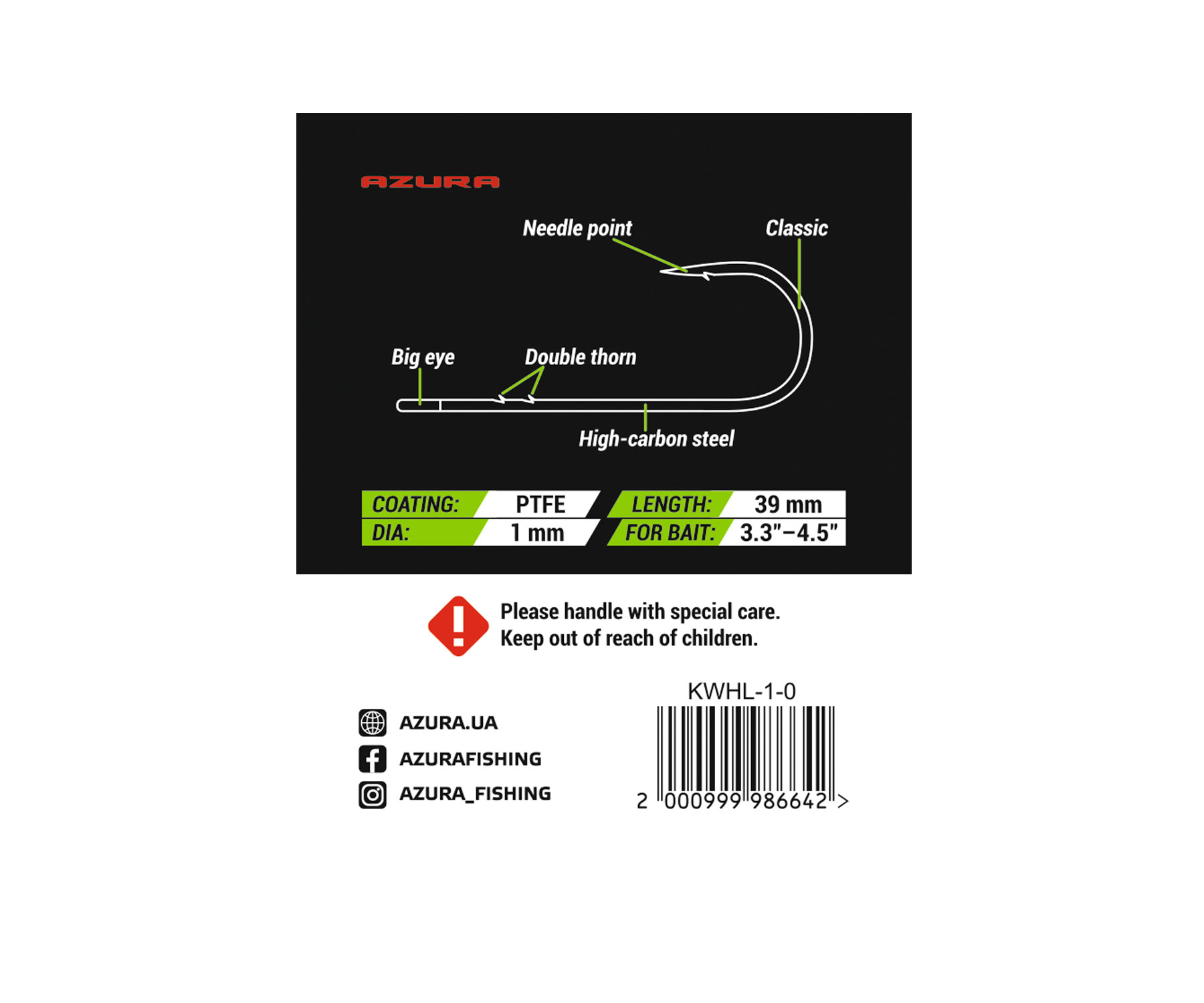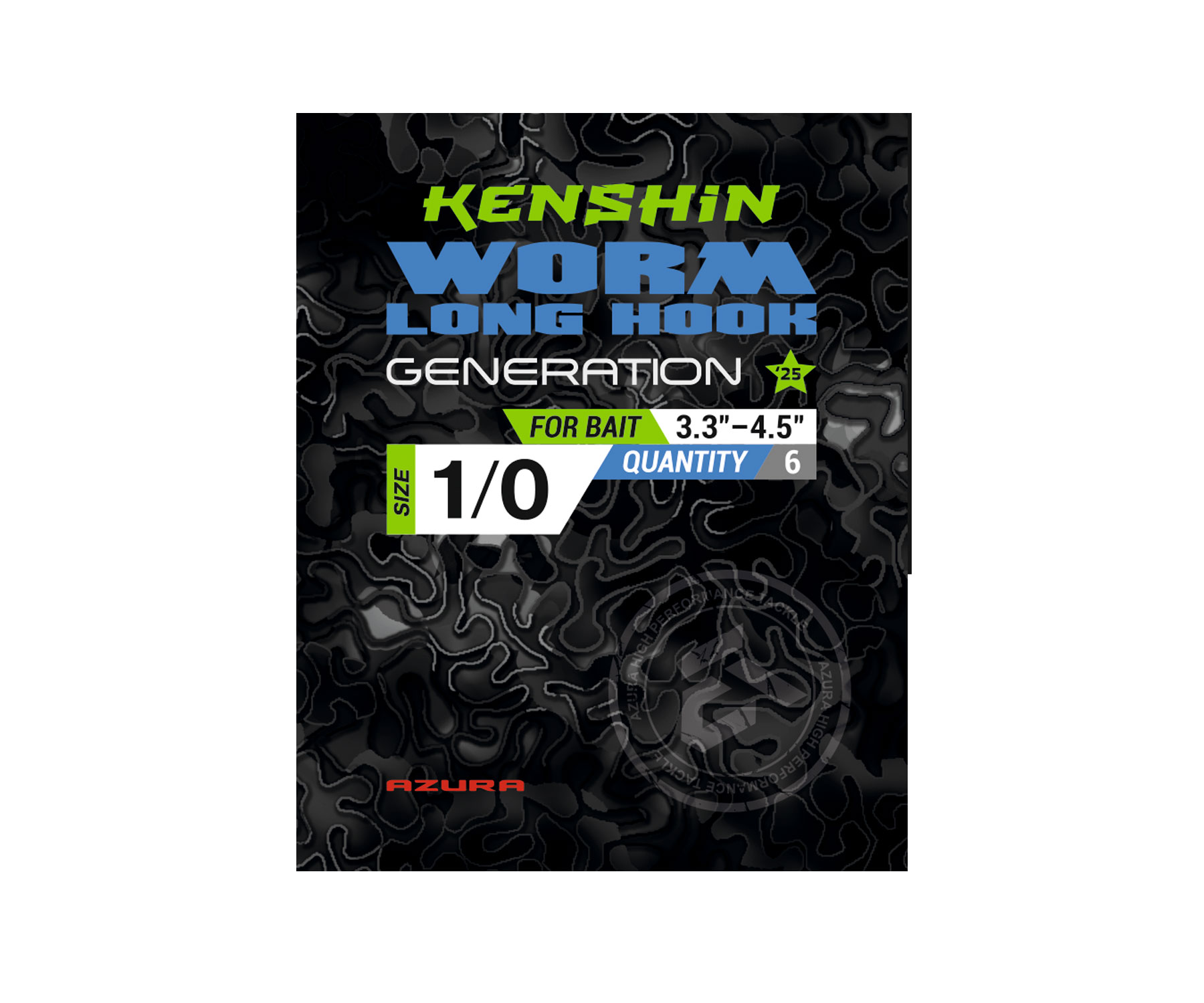 Azura Kenshin Worm Hook long – серія високоякісних одинарних гачків зі збільшеним вушком і класичною формою вигину, які призначено для використання в шарнірних та інших спінінгових монтажах. Гачки Azura Kenshin Worm Hook long ідеально поєднуються з більшістю м'яких пластикових приманок будь-яких форм. Гачки виготовлено з високовуглецевого сталевого дроту. Вони мають високу надійність, а також високу міцність на розгинання. Azura Kenshin Worm Hook long мають довгу цівку, кований піддів округлої форми, надгостре жало із заточкою Needle Point, що гарантує надійне засікання риби, акуратну чіпку борідку та високоякісне антикорозійне покриття PTFE, що значно покращує проникаючу здатність гачка. Крім того, дві спеціальні борідки на внутрішній стороні цівки сприяють кращому утриманню приманки під час закидань та клювань риби. Широкий розмірний ряд Azura Kenshin Worm Hook long дає змогу підібрати оптимальний за розміром гачок практично під будь-яку м'яку приманку від 0,8" до 4,5".