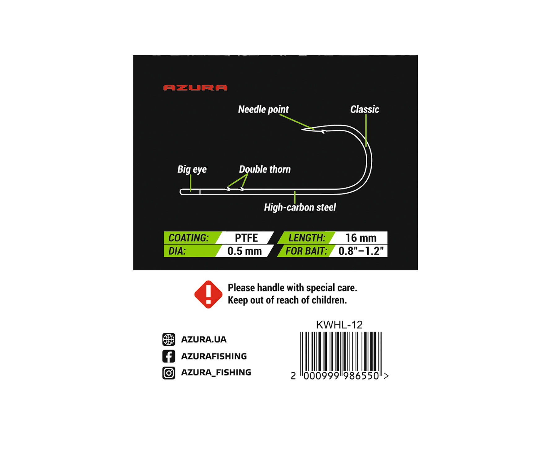Azura Kenshin Worm Hook long – серія високоякісних одинарних гачків зі збільшеним вушком і класичною формою вигину, які призначено для використання в шарнірних та інших спінінгових монтажах. Гачки Azura Kenshin Worm Hook long ідеально поєднуються з більшістю м'яких пластикових приманок будь-яких форм. Гачки виготовлено з високовуглецевого сталевого дроту. Вони мають високу надійність, а також високу міцність на розгинання. Azura Kenshin Worm Hook long мають довгу цівку, кований піддів округлої форми, надгостре жало із заточкою Needle Point, що гарантує надійне засікання риби, акуратну чіпку борідку та високоякісне антикорозійне покриття PTFE, що значно покращує проникаючу здатність гачка. Крім того, дві спеціальні борідки на внутрішній стороні цівки сприяють кращому утриманню приманки під час закидань та клювань риби. Широкий розмірний ряд Azura Kenshin Worm Hook long дає змогу підібрати оптимальний за розміром гачок практично під будь-яку м'яку приманку від 0,8" до 4,5".