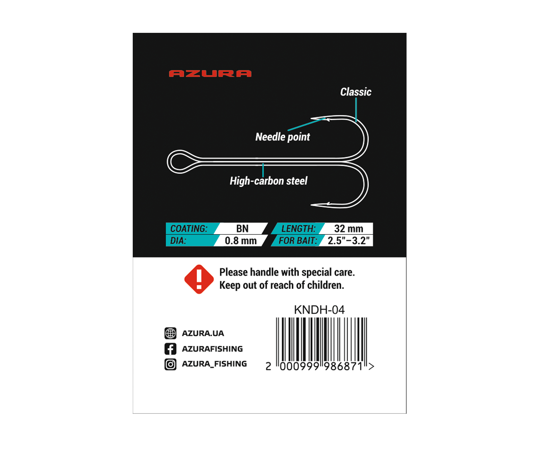 Azura Kinetik Double Hook – серія високоякісних подвійних гачків, які призначено для використання в шарнірних та інших спінінгових монтажах. Гачки виготовлено з високовуглецевого сталевого дроту. Вони мають високу надійність і міцність на розгинання. Для гачків Azura Kinetik Double Hook характерні стандартна довжина цівки, класична форма піддіву, надгостре жало із заточуванням Needle Point, що гарантує надійне засікання риби, акуратна борідка та високоякісне антикорозійне покриття Black Nickel. Двійники Azura Kinetik ідеально підходять для оснащення більшості м'яких пластикових приманок найрізноманітніших форм. Широкий розмірний ряд Azura Kinetik Double Hook дає змогу підібрати оптимальний за розміром гачок практично під будь-яку м'яку приманку з розміром від 2 до 5 дюймів.