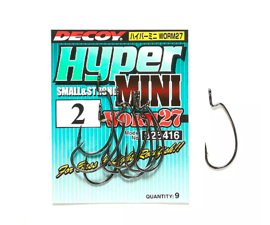Гачки Decoy Worm 27 Hyper Mini – це серія офсетних гачків, які створені для оснащення невеликих силіконових приманок у розмірах від 1 до 3 дюймів. Взагалі офсетні гачки Decoy Worm 27 Hyper Mini були розроблені для рокфішингу, проте вони знайшли широке застосування і в умовах наших прісноводних водойм. З їхньою допомогою можна оснащувати різноманітні мікроджигові та джигові приманки. Офсетні гачки серії Worm 27 Hyper Mini виготовлено з тонкого, але міцного і пружного високовуглецевого дроту. Жало гачка дуже гостре і зберігає своє заточування впродовж багатьох рибалок. Піддів має середні розміри. Невелике вушко припускає використання цих гачків або без завідних кілець, прив'язуючи повідець напряму, або із завідними кільцями з тонкого дроту. Гачки офсетні Decoy Worm 27 Hyper Mini розроблено для риболовлі в солоній морській воді, тому вони мають стійке покриття, що захищає їх від корозії.