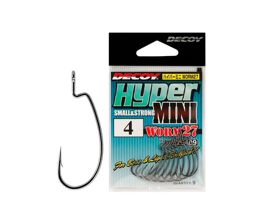 Гачки Decoy Worm 27 Hyper Mini – це серія офсетних гачків, які створені для оснащення невеликих силіконових приманок у розмірах від 1 до 3 дюймів. Взагалі офсетні гачки Decoy Worm 27 Hyper Mini були розроблені для рокфішингу, проте вони знайшли широке застосування і в умовах наших прісноводних водойм. З їхньою допомогою можна оснащувати різноманітні мікроджигові та джигові приманки. Офсетні гачки серії Worm 27 Hyper Mini виготовлено з тонкого, але міцного і пружного високовуглецевого дроту. Жало гачка дуже гостре і зберігає своє заточування впродовж багатьох рибалок. Піддів має середні розміри. Невелике вушко припускає використання цих гачків або без завідних кілець, прив'язуючи повідець напряму, або із завідними кільцями з тонкого дроту. Гачки офсетні Decoy Worm 27 Hyper Mini розроблено для риболовлі в солоній морській воді, тому вони мають стійке покриття, що захищає їх від корозії.