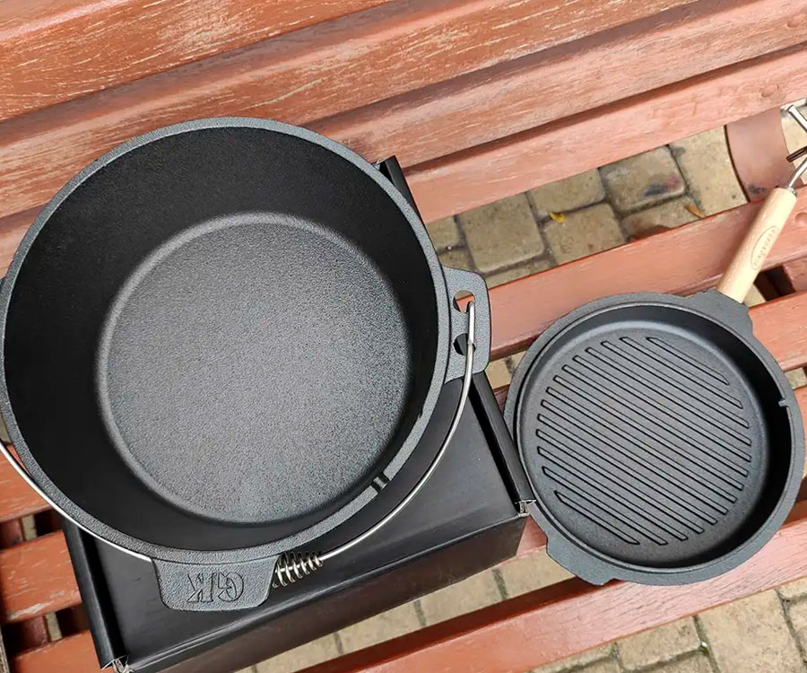 Набір для запікання казан+кришка+пательня, підйомник 2в1 Gusskönig 12л. Набір включає зручну підставку та спіральну ручку, яка легко лягає в руку. У комплекті також є щітка для чищення, з якою ви зможете легко видалити стійкі залишки. 100% зручність – чавунний казан був розробленій німецькими інженерами з акцентом на комфорт у використанні.