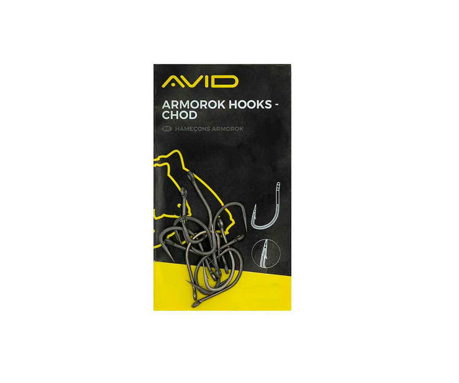 Avid Carp Armorok Hooks - Chod – потужні коропові гачки з покриттям PTFE, які виготовлено з високоякісної вуглецевої сталі. Модель Armorok Hooks - Chod має неширокий вигин, кований піддів, середньої довжини цівку з трохи відігнутим кільцем і пряме жало з чіпкою борідкою. Винятково гостре та міцне жало з унікальним точково-шліфувальним заточуванням, забезпечує легке проникнення в тканини риб'ячої пащі. Тефлонове покриття знімає відблиски в прозорій воді, захищає гачок від корозії, сприяє тривалому збереженню гостроти жала та підвищує його проникну здатність на 50%. Завдяки своїй формі та товщині дроту гачок відмінно тримає велику рибу під час виважування. Форма гачка Avid Carp Armorok Hooks - Chod забезпечує оптимальний потенціал зачепа під час використання pop-up приманок та робить його ідеальним для застосування з жорсткими повідцями для монтажу Chod та жорсткою монониткою.