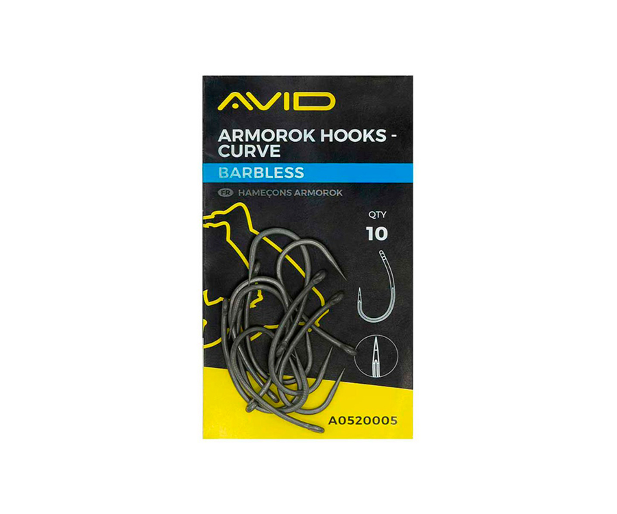 Avid Carp Armorok Hooks - Curve – потужні коропові гачки з покриттям PTFE, які виготовлено з високоякісної вуглецевої сталі. Модель Armorok Hooks - Curve Barbless має широкий вигин під кутом 25°, кований піддів, середньої довжини цівку з відігнутим всередину кільцем і пряме жало без борідки. Винятково гостре та міцне жало з унікальним точково-шліфувальним заточуванням, забезпечує легке проникнення в тканини риб'ячої пащі. Тефлонове покриття знімає відблиски в прозорій воді, захищає гачок від корозії, сприяє тривалому збереженню гостроти жала та підвищує його проникну здатність на 50%. Завдяки своїй формі та товщині дроту гачок відмінно тримає велику рибу під час виважування. Форма гачка Avid Carp Armorok Hooks - Curve забезпечує оптимальний потенціал засікання риби та робить його ідеальним для застосування з будь-якими повідцевими матеріалами.