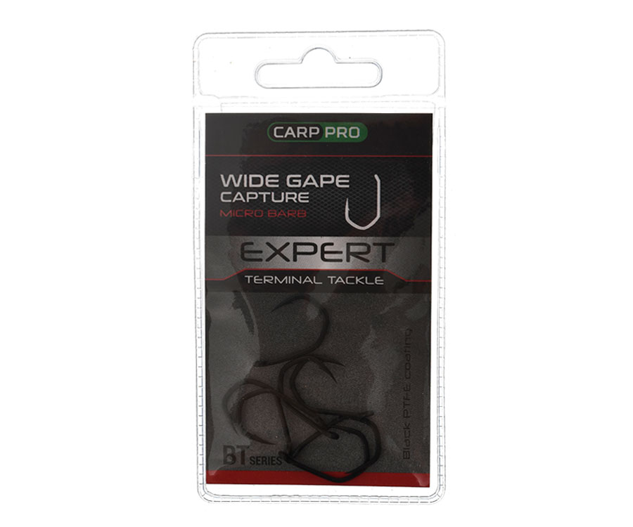 Carp Pro Wide Gape Сapture BT – гачок з екстремальним дизайном для максимальної міцності та боротьби з найбільшим коропом. Має широкий піддів, коротку цівку, трохи загнуті всередину жало й вушко, а також агресивний вигин, який підвищує міцність гачка та засікання риби. Форма гачка Wide Gape Сapture BT чудово підходить для будь-якої презентації як тонучих, повільно тонучих, збалансованих, так і плаваючих насадок будь-якого типу. Вушко гачка на 5˚ загнуто в сторону жала – це значно покращує засікання завдяки швидкому розвороту гачка в роті риби. Wide Gape Сapture рекомендовано використовувати з плетеним повідцевим матеріалом як в оболонці, так і без неї в усіх коропових монтажах. Не рекомендовано застосовувати з цими гачками жорсткі монофільні жилки та флюорокарбон. Усі гачки серії Wide Gape мають мікроборідку.