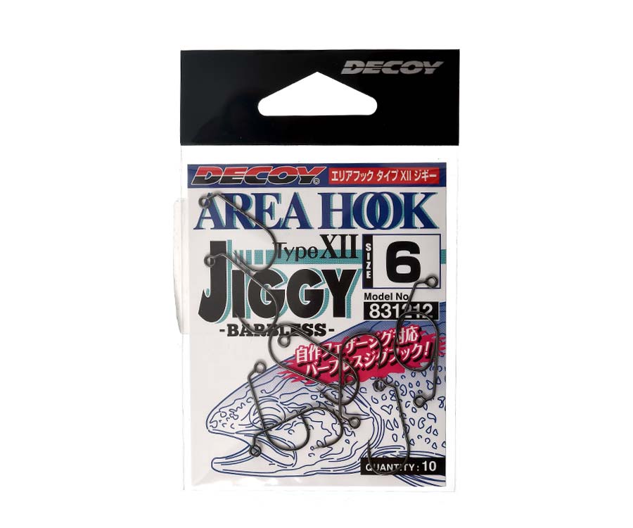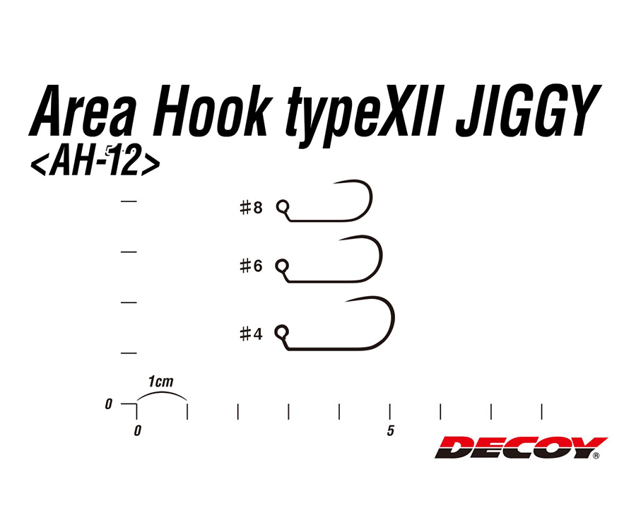 Decoy AH-12 Area Hook Jiggy – надійні та досить міцні гачки, які призначено для виготовлення джигових монтажів для ловлі форелі. Гачки не мають борідки. Їх виготовлено із високоякісної вуглецевої сталі. Decoy AH-12 Area Hook мають кований піддів, середньої довжини цівку, широкий округлий загин, пряме гостре жало, розвернуте на 90 градусів велике кільце та захисне покриття темного кольору. Їхню цівку ідеально пристосовано для насаджування силіконових приманок, а вушко, розташоване під деяким кутом, припускає кріплення під ним невеликий вантаж-головки. Модель можна використовувати для в'язання стримерів та мух. Тонкий дріт гачка не перевантажує невеликі приманки, але має достатню міцність для виважування жвавої форелі. Гачки Decoy AH-12 Area Hook Jiggy також підійдуть для мікроджигової ловлі окуня та невеликої щуки.