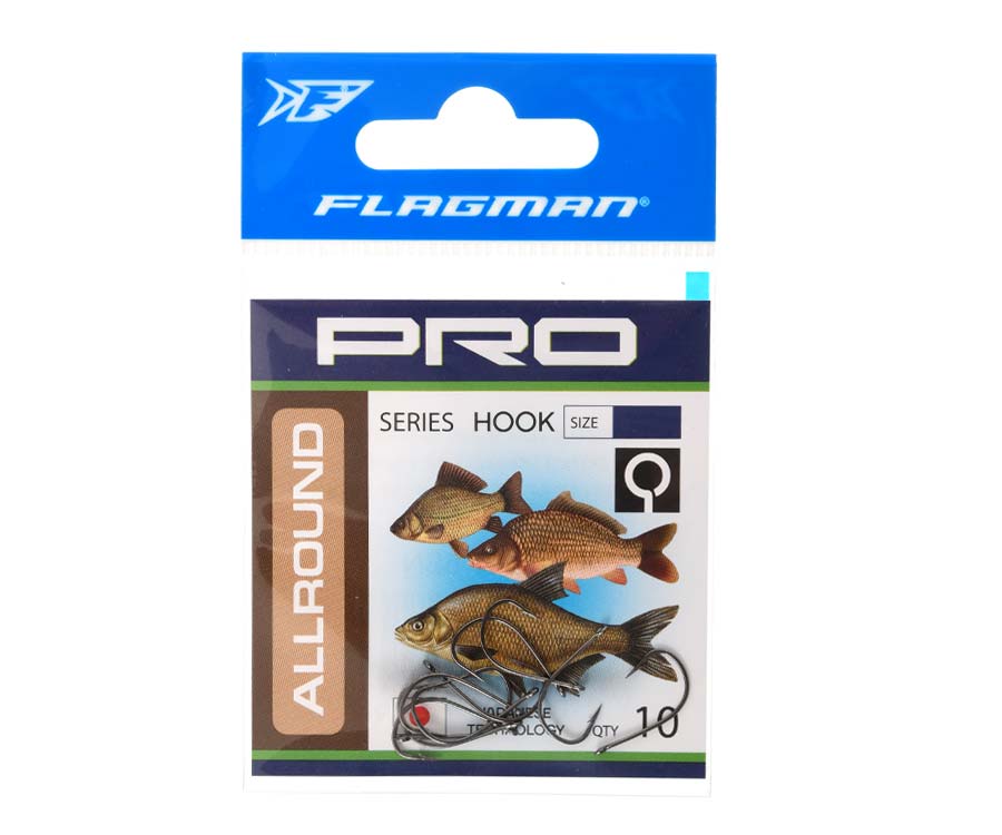 Flagman Pro Allround – серія високоякісних універсальних гачків, які вироблено за японською технологією. Гачки Flagman Pro Allround мають класичну форму, широкий округлий вигин, кований піддів, середню цівку з кільцем для прив'язування й гостре пряме жало з лазерним заточуванням. Гачки серії Pro Allround дуже зачеписті й характеризуються максимальною реалізацією клювань риби. Їх виготовлено з тонкого сталевого дроту з якісним антикорозійним покриттям. Вони стануть у пригоді як для фідерної, так і для поплавцевої ловлі риби на об'ємні насадки рослинного й тваринного походження. Гострозаточене жало й чіпка борідка гарантують ефективне підсікання й упевнене утримання будь-якої риби, із заподіянням їй мінімальної шкоди. Залежно від величини передбачуваної здобичі й типу оснастки, ви легко підберете гачки необхідного розміру.