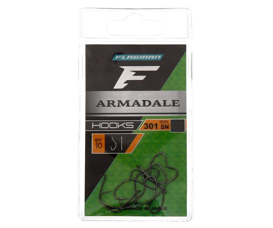 Flagman Hook Armadale – новинка, серія висококласних риболовних гачків, вироблених у Японії. Гачки Flagman Hook Armadale вирізняються високою якістю виготовлення і максимально задовольняють усім вимогам риболовів. Модель гачків Armadale 301 має виражену лящово-карпову форму, вигин типу «мушля», широкий піддів, коротку цівку з кільцем, акуратну чіпку борідку та пряме надзвичайно гостре жало з лазерним заточуванням. Гачки виготовлені з високовуглецевого сталевого дроту та мають антикорозійне покриття Black Nickel. Тривалий час зберігають первинну гостроту жала. Вони чудово підійдуть як для фідерної, так і для поплавцевої ловлі ляща, коропа, карася, плітки на об'ємні насадки рослинного і тваринного походження. Для серії Flagman Hook Armadale 301 характерні висока міцність, чудова зачепистість і максимальна реалізація клювань. Залежно від величини ймовірної здобичі та оснастки, ви зможете легко підібрати гачки необхідного розміру. Доступні в розмірах № 8, 10, 12, 14. В упаковці: 10 шт.