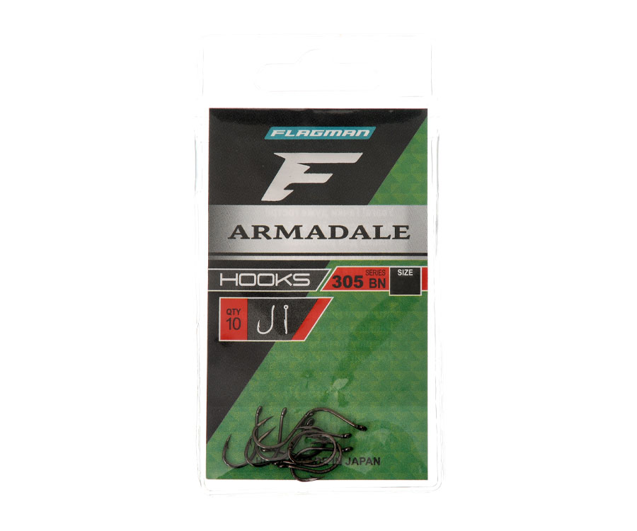 Flagman Hook Armadale – новинка, серія висококласних риболовних гачків, вироблених у Японії. Гачки Flagman Hook Armadale вирізняються високою якістю виготовлення і максимально задовольняють усім вимогам риболовів. Модель гачків Armadale 305 має напівкруглий вигин, кований піддів, середньої довжини цівку з відігнутим назовні кільцем, акуратну чіпку борідку, загнуте всередину й у бік надгостре жало з лазерним заточуванням. Гачки виготовлено з високовуглецевого сталевого дроту та мають антикорозійне покриття Black Nickel. Тривалий час зберігають первинну гостроту жала. Вони чудово підійдуть як для фідерної, так і для поплавцевої ловлі коропа, карася, лина, ляща, плітки на об'ємні насадки рослинного і тваринного походження. Для серії Flagman Hook Armadale 305 характерні висока міцність, чудова зачепистість і максимальна реалізація клювань. Залежно від величини ймовірної здобичі та оснастки, ви зможете легко підібрати гачки необхідного розміру. В упаковці: 10 шт. Доступні в розмірах № 8, 10, 12.