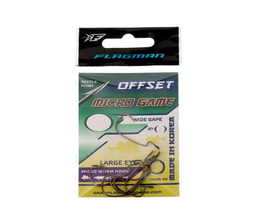 Flagman Micro Game Offset – серія невеликих офсетних гачків, які відкривають перед риболовом можливість застосовувати мікроджигові приманки в закоряжених місцях. Гачки мають досить широкий піддів, що дає змогу насаджувати на них м'які приманки різних типів. Виключно гостре жало в поєднанні з тонким дротом забезпечують чудову проникаючу здатність – для результативного підсікання досить зовсім невеликого зусилля. Водночас, завдяки круглому, без ріжучих граней, перетину жала гачок сидить у пащі риби щільно та має мінімальний шанс вилетіти під час виважування. Збільшене вушко забезпечує необхідний ступінь свободи гачка під час використання його на шарнірному монтажі, який у нас навіть у незачіпних монтажах популярніший за класичний «Техас». Гачки Flagman Micro Game Offset доступні в розмірах 4, 6, 8, 10.