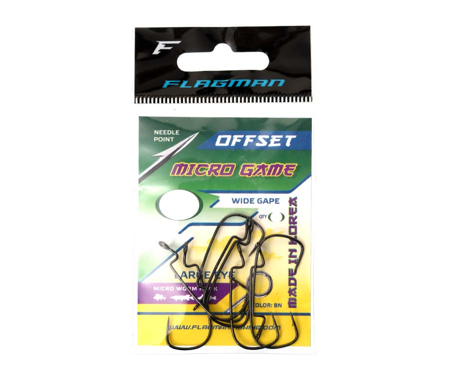Flagman Micro Game Offset – серія невеликих офсетних гачків, які відкривають перед риболовом можливість застосовувати мікроджигові приманки в закоряжених місцях. Гачки мають досить широкий піддів, що дає змогу насаджувати на них м'які приманки різних типів. Виключно гостре жало в поєднанні з тонким дротом забезпечують чудову проникаючу здатність – для результативного підсікання досить зовсім невеликого зусилля. Водночас, завдяки круглому, без ріжучих граней, перетину жала гачок сидить у пащі риби щільно та має мінімальний шанс вилетіти під час виважування. Збільшене вушко забезпечує необхідний ступінь свободи гачка під час використання його на шарнірному монтажі, який у нас навіть у незачіпних монтажах популярніший за класичний «Техас». Гачки Flagman Micro Game Offset доступні в розмірах 4, 6, 8, 10.