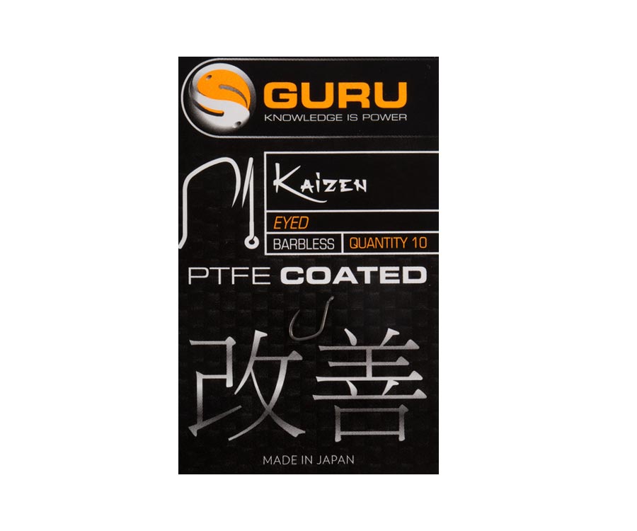 Guru Kaizen Eyed Barbless – міцні та надійні гачки з тефлоновим покриттям PTFE. Оброблена за цією технологією поверхня стає неймовірно слизькою, що значно збільшує проникаючу здатність гачка. Крім того, PTFE покриття виключає будь-які відблиски, роблячи гачок максимально непомітним для риби. Серія гачків Guru Kaizen Eyed Barbless підійде для різних способів ловлі на об'ємні насадки тваринного та рослинного походження. Гачки Kaizen Eyed Barbless характеризуються широким вигином, кованим піддівом, надзвичайно гострим загнутим всередину жалом без борідки та короткою цівкою з кільцем для прив'язування. Відігнуте назовні вушко робить гачок ідеальним як для поплавцевої, так і для фідерної ловлі. Спеціальна форма піддіва надійно фіксує гачок у тканинах рота, що запобігає сходам і травмуванню риби навіть за екстремального виважування.