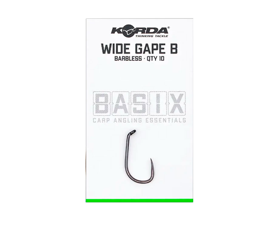 Korda Basix Wide Gape Micro Barbed Hook – універсальний гачок, який розроблено для використання в різних оснастках, незалежно від того ловите ви на донні приманки, поп-апи чи вафтерси. Агресивний вигин Korda Basix Wide Gape гарантує, що він розвернеться й надійно зафіксується в роті риби, без використання кикера або термозбіжної трубки. Має високу міцність, широкий піддів, середньої довжини цівку із загнутим всередину вушком, найгостріше загнуте всередину жало з мікроборідкою й покриттям чорний нікель.