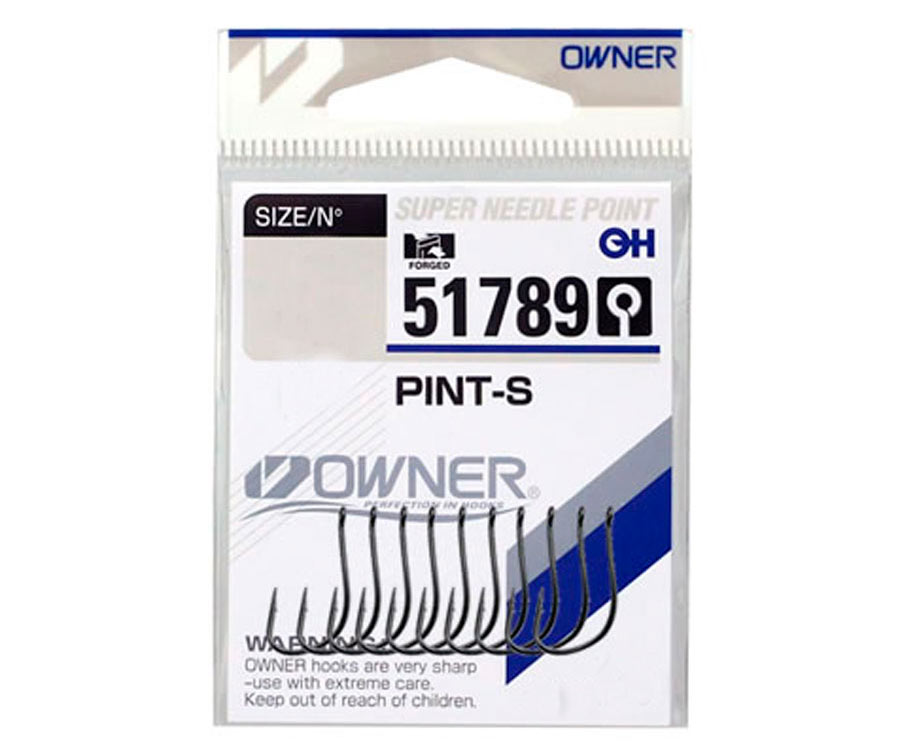 Owner Pint-S 51789 – серія міцних універсальних гачків, які виготовлено з високоякісної вуглецевої сталі. Гачки Owner 51789 мають широкий напівокруглий загин, кований піддів, пряме тонке жало, нормальної довжини цівку з трохи відігнутим назовні кільцем і захисне покриття Black Chrome. Owner Pint-S з успіхом використовують у донних і поплавцевих оснастках для ловлі риби на об'ємні насадки тваринного й рослинного походження. Проникливе жало й акуратна борідка гарантують ефективне підсікання й впевнене утримання риби, що клюнула.