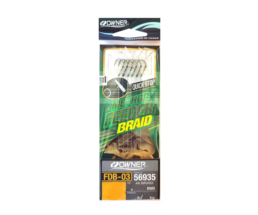 Owner Method Feeder FDB-03 – серія готових повідців для метод-фідерної ловлі коропа та іншої риби. Волосяний монтаж виготовлено із застосуванням високоякісного плетеного шнура (повідцевого матеріалу) та надійних гачків. Крім того, на волосі встановлено спеціальний стопор для насадки Quick Stop. Тепер вам достатньо проштовхнути стопор крізь отвір у бойлі або пелетсі, розвернути Quick Stop перпендикулярно отвору і вашу насадку буде надійно закріплено на волосі! У повідцях Owner 56935-03 використовують гачки Owner Iseama With Eye, що мають широкий округлий загин, кований піддів, загнуте в сторону цівки найгостріше жало, вкорочену цівку з кільцем для прив'язування та захисне покриття Black Chrome. Покриття темного кольору захищає гачок від корозії й маскує його на тлі темного дна. Пронизливе жало, що зберігає гостроту навіть в найскладніших умовах, і нормальної величини борідка гарантують ефективне підсікання, а також впевнене утримання риби, що клюнула.