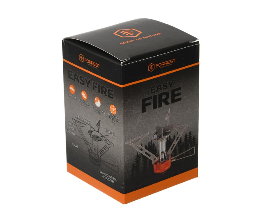 Газовий пальник Forrest Easy Fire FRT-103 – ефективний пальник з кріпленням на балон. Основною причиною вибору Forrest Easy Fire є вбудований базовий захист конфорки від вітру. Це допоможе більш ефективно готувати їжу, особливо в горах, де часто дме сильний вітер. Інші переваги за якими варто звернути увагу на цей пальник Forrest: мала вага, компактність і, що не менш важливо, пластиковий кофр в комплекті, який захищає пальник від пошкоджень під час транспортування. Конфорку та інші елементи виготовлено з нержавіючої сталі. Основу, що містить клапан і різьблення на картриджі EN417, виготовлено з анодованого алюмінію.