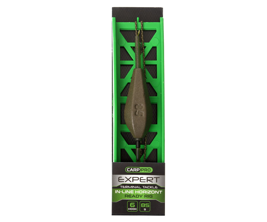 Повністю готовий до використання монтаж Carp Pro In-line Horizont на ледкорі. Оснастка Carp Pro In-line Horizont складається з ледкору (45 lb, 50 см), грузила In-line Horizont і повідця (30 lb, 15 см) з гачком Wide Gape №6. Грузило має шестигранний профіль і грушоподібну форму, тому чудово утримує оснастку на брівках і схилах біля мілин. Головними особливостями цієї простої універсальної оснастки є ідеальне засікання риби та можливість застосування ПВА-пакетів. Форма грузила дає змогу використовувати оснастку практично на всіх типах дна, крім глибокого мулу. Лідер із ледкору щільно притискає оснастку до дна водойми. Монтаж вирізняється великою дальністю закидання.