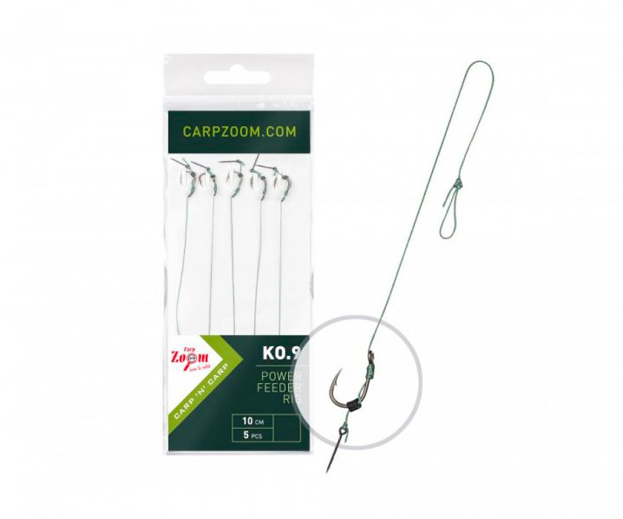 Повідець методний Carp Zoom Power Feeder Rig KO.9 – повністю готовий до використання повідець, ідеальний для фідерної та метод-фідерної ловлі. Carp Zoom Power Feeder Rig виготовлено з використанням якісного гачка, 8-жильного повідцевого матеріалу діаметром 0,18 мм і голки для насадки завдовжки 10 мм, прив'язаної до волосу. Довжина повідця Carp Zoom Power Feeder Rig – 10 см. Петля допомагає закріпити повідець на оснастці. В упаковці: 5 повідців.