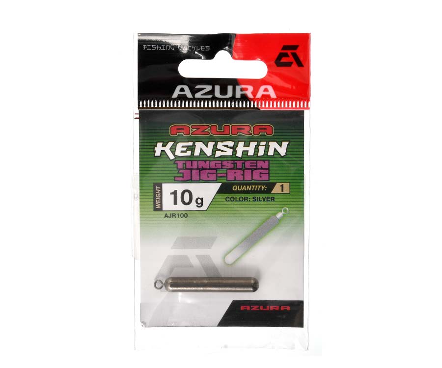 Azura Kenshin Tungsten Jig-Rig – вольфрамове грузило для оснастки «джиг-ріг». Має витягнуту циліндричну форму. Якісний вбудований вертлюг перешкоджає перекручуванню жилки, а витягнута форма грузила Azura Kenshin Tungsten Jig-Rig гарантує низьку зачепистість і далеке закидання оснастки. Вольфрам має більшу щільність, ніж сплави зі свинцю, тому грузила з нього виходять меншого розміру. А це позитивно позначається на дальності й точності закидання. Крім того, вольфрамові грузила більш «дзвінкі», що помітно підвищує чутливість снасті. Kenshin Tungsten Jig-Rig виготовляють у широкому діапазоні ваги й розмірів.