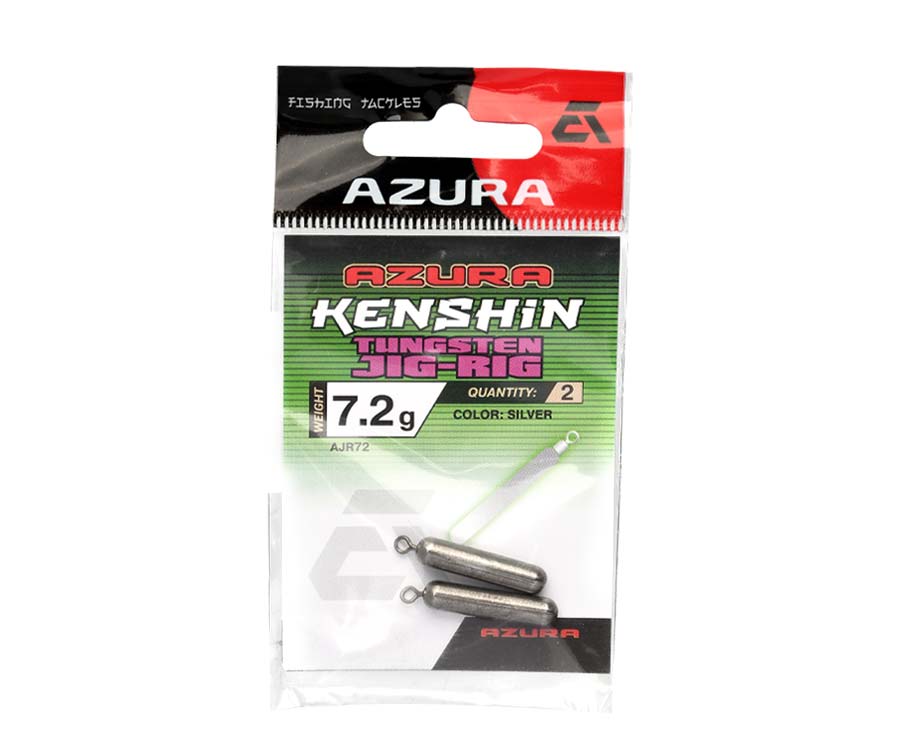 Azura Kenshin Tungsten Jig-Rig – вольфрамове грузило для оснастки «джиг-ріг». Має витягнуту циліндричну форму. Якісний вбудований вертлюг перешкоджає перекручуванню жилки, а витягнута форма грузила Azura Kenshin Tungsten Jig-Rig гарантує низьку зачепистість і далеке закидання оснастки. Вольфрам має більшу щільність, ніж сплави зі свинцю, тому грузила з нього виходять меншого розміру. А це позитивно позначається на дальності й точності закидання. Крім того, вольфрамові грузила більш «дзвінкі», що помітно підвищує чутливість снасті. Kenshin Tungsten Jig-Rig виготовляють у широкому діапазоні ваги й розмірів.