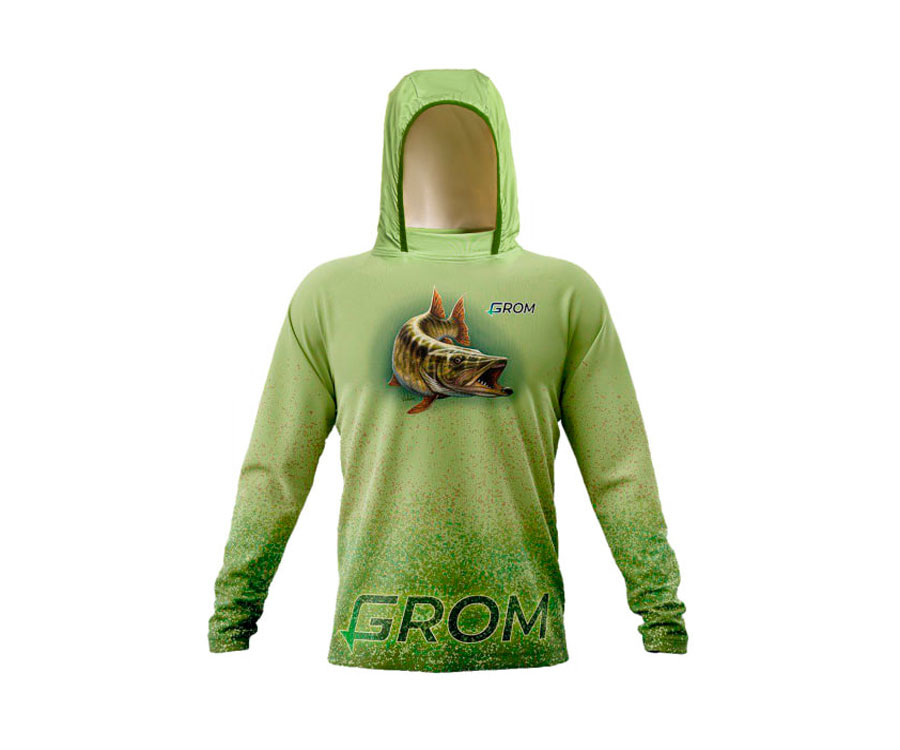 Худі для рибалки із зображенням щуки. Малюнок повністю унікальний, виконаний на замовлення компанії Grom. Худі має світло-зелений колір з яскравими акцентами на малюнку на грудях та графічному принті в нижній частині тіла та рукавів. Це робить його досить стильним, в той же час яскравим та індивідуальним. Цей дизайн створено спеціально для фанатів ловлі щуки. Виготовлено з дихаючої спортивної тканини Milk Silk. Це 100% поліестер. Переваги: тягнеться у чотирьох напрямках та дуже комфортна до тіла; тканина має рівень захисту від ультрафіолету UPF 50+; кофта дуже швидко сохне; зображення наноситься методом сублімації та не втрачає колір після прання або під впливом сонячного проміння. Прати у режимі «синтетика» при температурі не вище за 40 градусів або ручне прання. Прасувати на температурі не вище за 150 градусів або у режимі «шовк» чи «синтетика». Якщо сушити кофту у рівному положенні, то складок не виникатиме і прасування не буде потрібно.