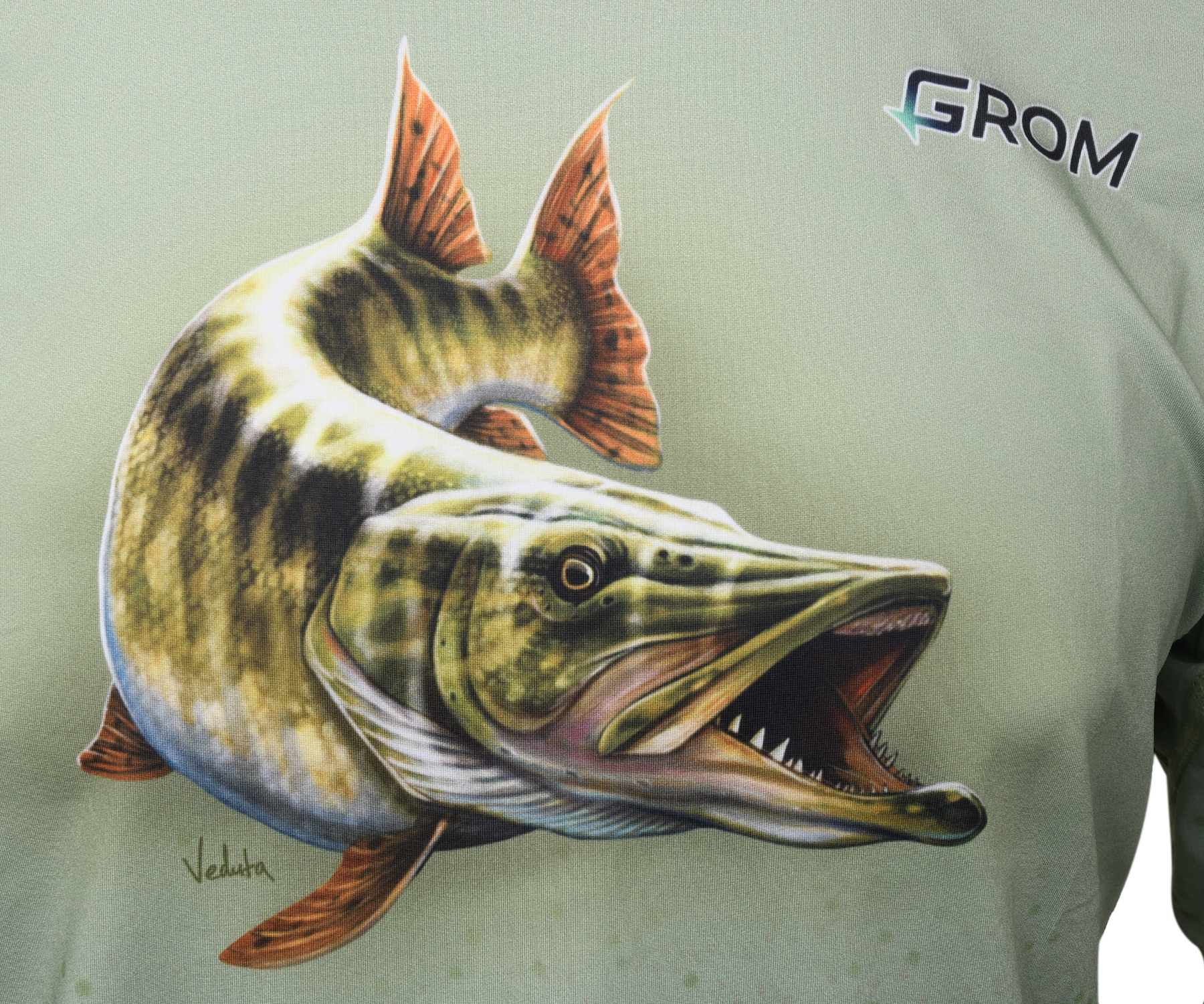 Худі із зображенням щуки Grom Aire Pike UPF50+. Малюнок повністю унікальний, виконаний на замовлення компанії GROM. Худі Grom Aire Pike має світлий колір із яскравими акцентами на малюнку на грудях і графічному принті в нижній частині тіла та рукавів. Це робить дизайн строгим і стильним, водночас яскравим та індивідуальним. Цей дизайн створено для фанатів спінінгової риболовлі. Виготовлена кофта з 100% поліестеру – дихаючої спортивної тканини Milk Silk.