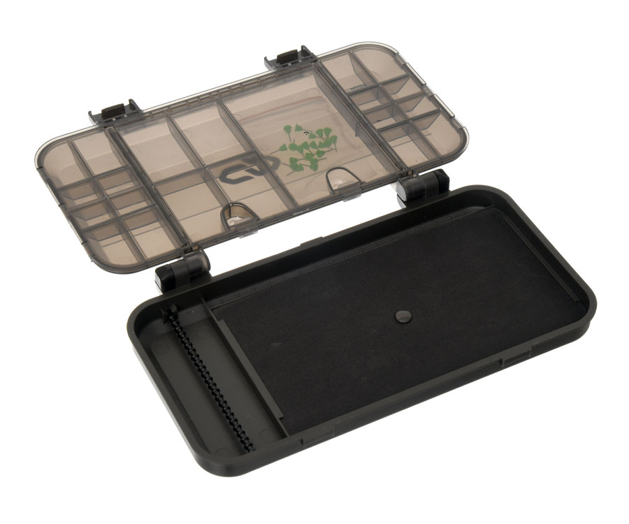 Коробка коропова Carp Pro Mini Tackle & Rig Box – двосторонній пластиковий кейс-органайзер, який створено спеціально для зберігання і транспортування готових монтажів, комплектуючих до оснасток, термінальних снастей та аксесуарів, які використовують в короповій ловлі. Набір складається з кейса, у верхній частині якого розміщено 21 відділення для зберігання риболовного дріб'язку та аксесуарів, які закриваються прозорими кришками. У нижній частині розташована повідочниця, яка дає змогу зберігати готові повідці різної довжини. Коробку-органайзер Carp Pro Mini Tackle & Rig Box виготовлено з міцного якісного ABS-пластику, що не втрачає своїх властивостей із часом, та обладнано потужними защібками й надійними петлями. Розміри: 28,5х20,5х7 см.