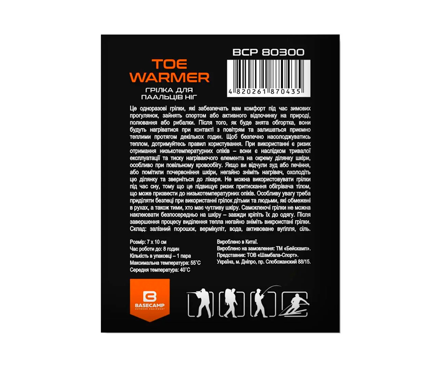 Хімічна грілка для пальців ніг Base Camp Toe Warmer - це одноразові грілки, які забезпечать вам комфорт під час зимових прогулянок, зайнять спортом або активного відпочинку на природі, полювання або рибалки. Після того, як буде знята обгортка, вони будуть нагріватися при контакті з повітрям та залишаться приємно теплими протягом декількох годин. Щоб безпечно насолоджуватись теплом, дотримуйтесь правил користування.