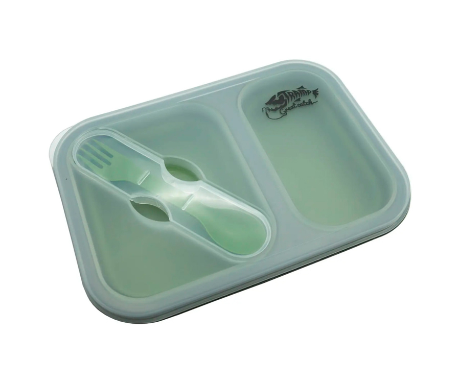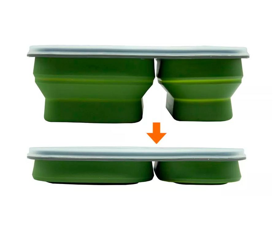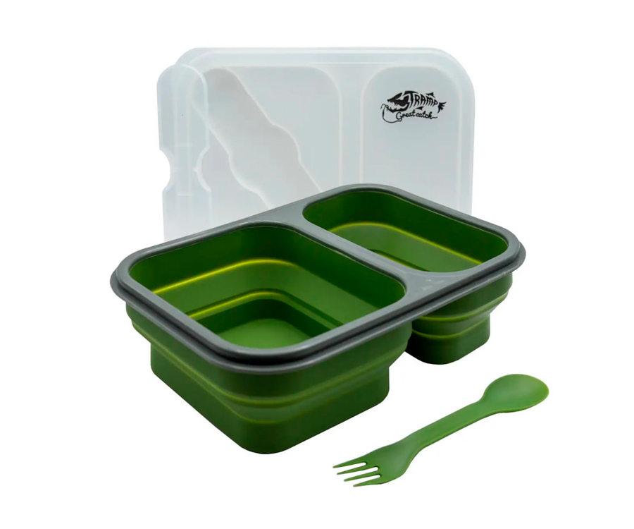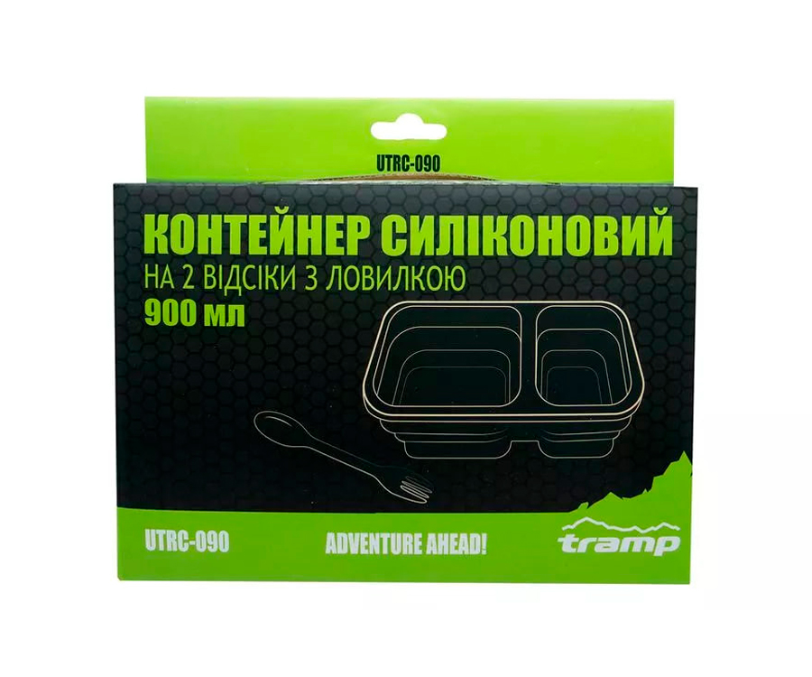 Складаний силіконовий контейнер для їжі Tramp, який відмінно підійде для подорожей та відпочинку на природі, має 2 окремі відсіки з харчового силікону об'ємом 900 мл та може використовуватися як похідна миска, ланчбокс. Контейнер укомплектований столовим приладом, який є поєднанням ложки та вилки та зберігається у кришці контейнера.