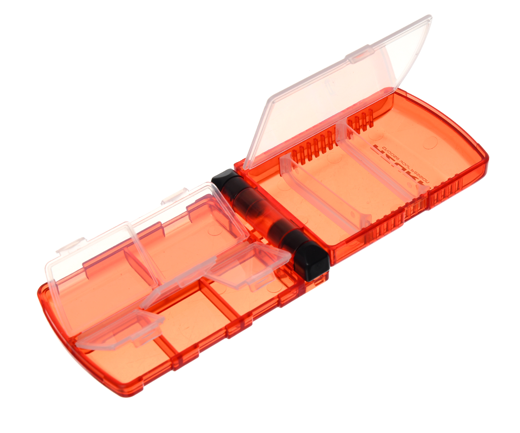 Azura Safina Takle Box #100 – пластикова коробка, що складається вдвічі та спеціально розроблена для зберігання гачків, вертлюжків, застібок, завідних кілець та інших риболовних аксесуарів. Коробку Azura Safina Takle Box #100 виготовлено з високоякісного кольорового прозорого пластику, вона вирізняється сучасним дизайном і довговічністю. Добре підігнані кришки та надійні защібки оберігають вміст коробки від проникнення вологи і бруду.