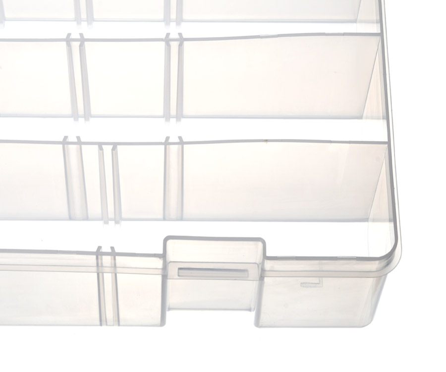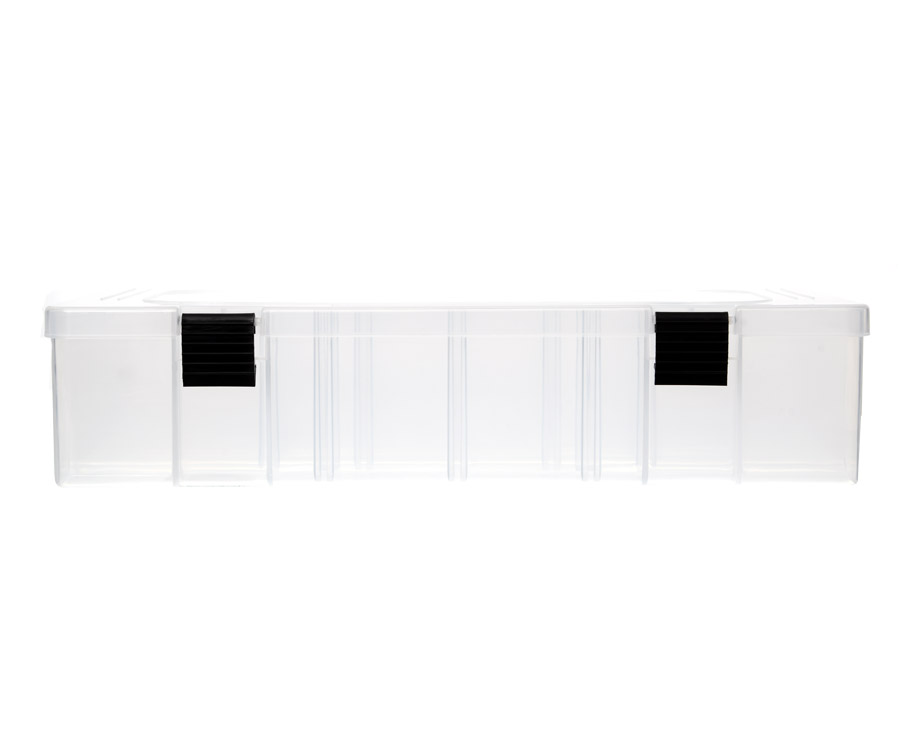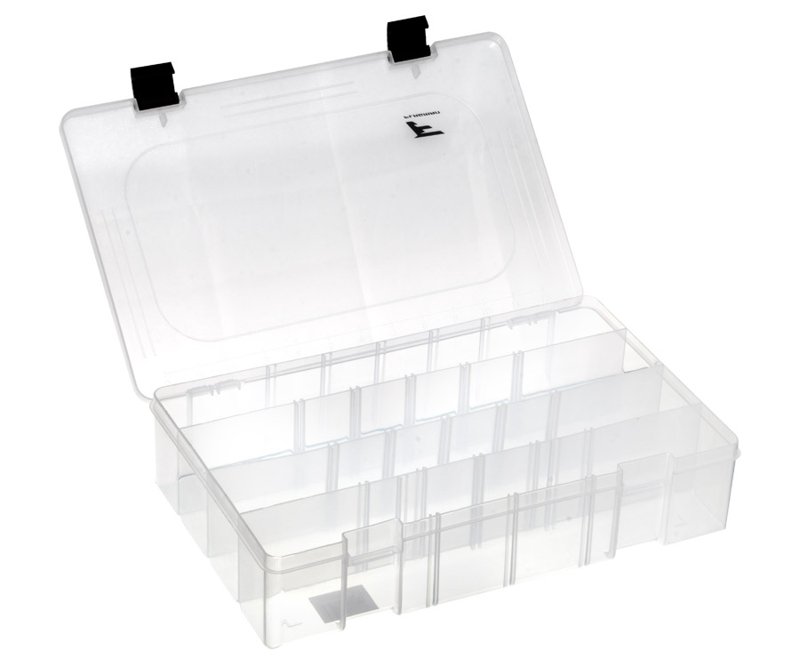 Flagman Tackle Box #13 – містка одностороння коробка, яку виготовлено з прозорого ударостійкого пластику. Завдяки системі знімних перегородок відмінно підійде для зберігання і транспортування приманок різноманітних типів і розмірів, а також джиг-головок, елементів оснастки та інших аксесуарів. Кришка рибальської коробки Flagman Tackle Box #13 закривається на дві міцні надійні защібки. Розміри: 36x22,5x8 см.