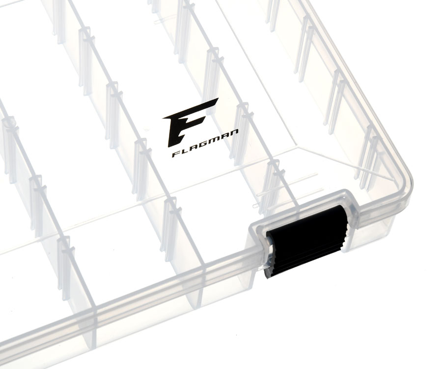 Flagman Tackle Box #20 – містка одностороння коробка, яку виготовлено з прозорого ударостійкого пластику. Завдяки системі знімних перегородок відмінно підійде для зберігання і транспортування приманок різноманітних типів і розмірів, а також джиг-головок, елементів оснастки та інших аксесуарів. Кришка рибальської коробки Flagman Tackle Box #20 закривається на дві міцні надійні защібки. Розміри: 30x18x4,3 см.