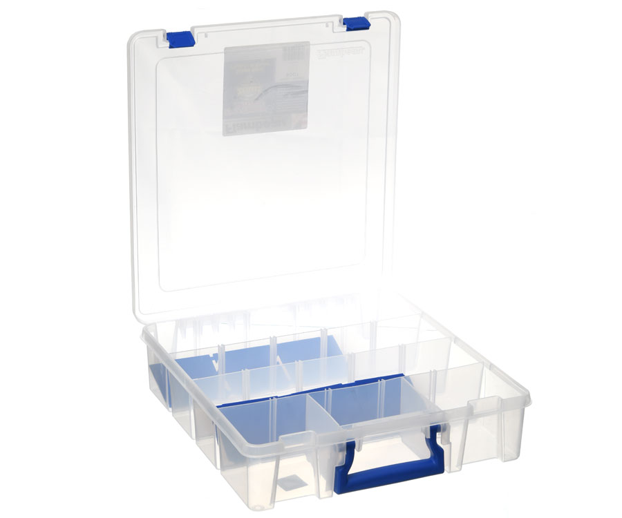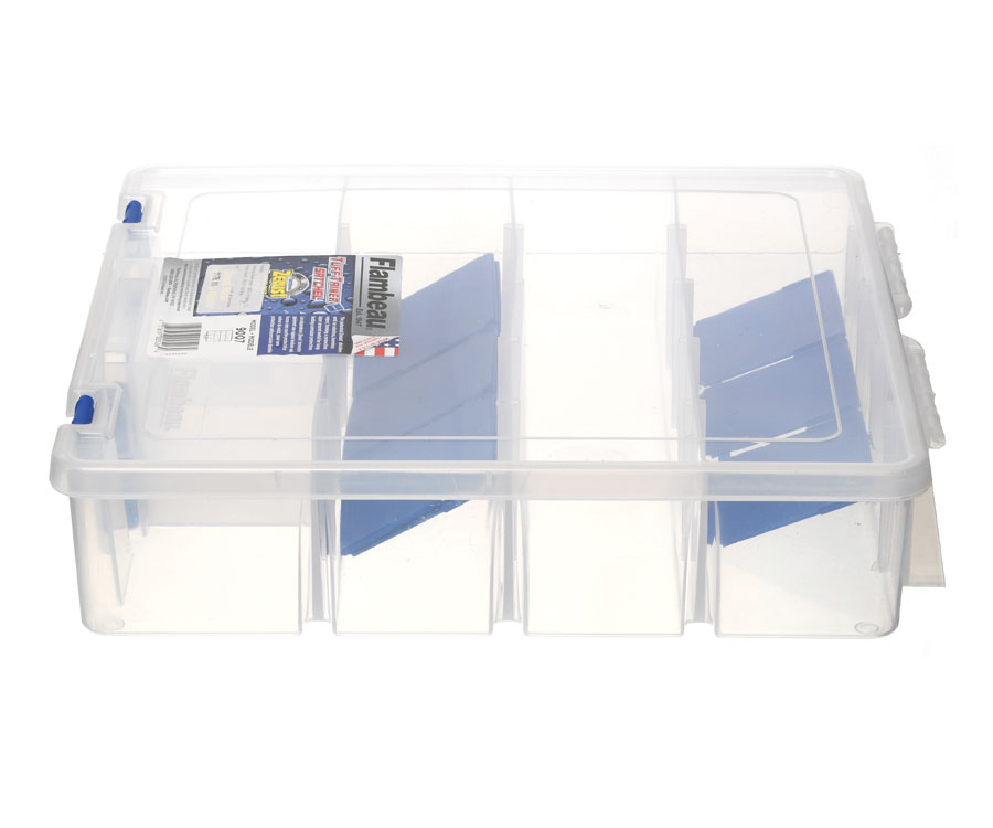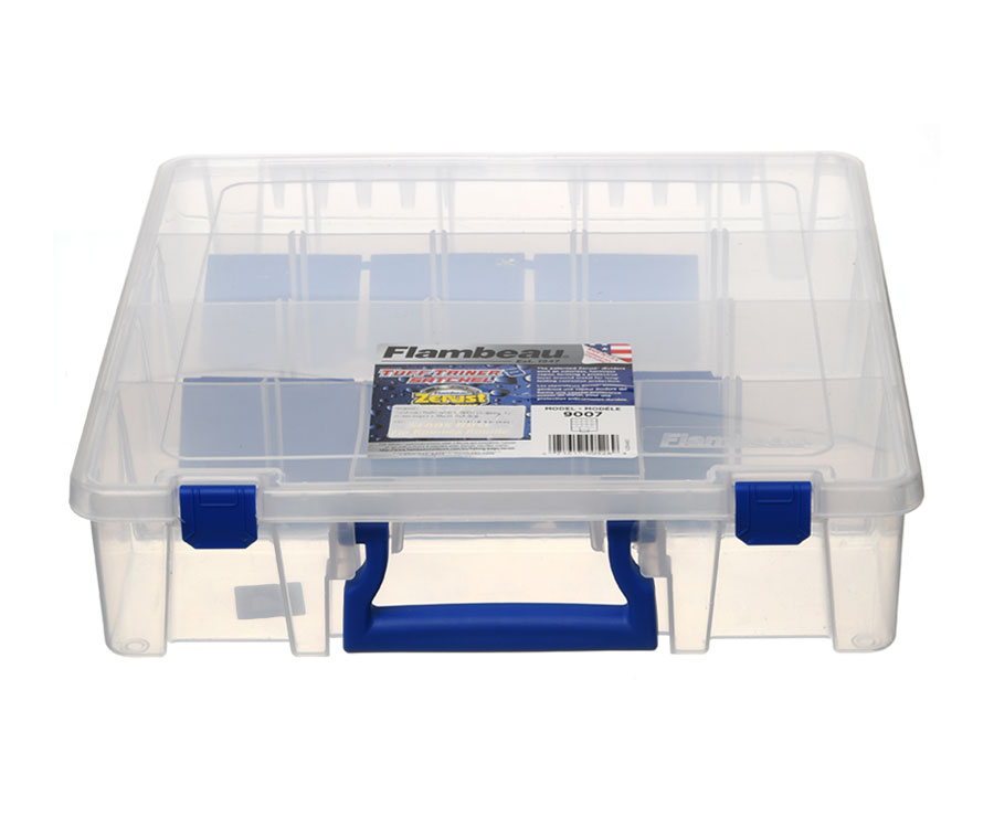 Зручний невеликий кейс для рибальського спорядження Flambeau Taff Tainer 9007, виробництва США, являє собою напівпрозору коробку, яка має 16 глибоких відділень (5 фіксованих і 12 знімних перегородок) для зберігання великих приманок. Корпус кейса виготовлено з високоміцного пластику, а для виготовлення перегородок Tuff Tainers виробник використав технологію із застосуванням полімеру Zerust, що дає змогу уникнути виникнення корозії та іржі на будь-яких металевих деталях. Завдяки повільному випаровуванню інгібітора, що міститься в складі пластику, який за незалежними дослідженнями є абсолютно безпечним, рибальські приманки вкриваються найтоншим протикорозійним шаром. Термін активного випаровування полімеру Zerust становить близько п'яти років, що забезпечує надійний захист риболовних снастей на цей же термін. Також необхідно відзначити детально продуманий дизайн кейса Flambeau Taff Tainer 9007. Практично прозора коробка зменшує кількість відкривань-закривань – вміст добре видно зовні. Знімні перегородки дають змогу регулювати розмір відділень і дозволяють зберігати приманки будь-яких розмірів. Використання інноваційного пластику істотно зменшило вагу кейса, зробивши його комфортним і легким у транспортуванні. Розміри: 38х35,6х8,9 см.