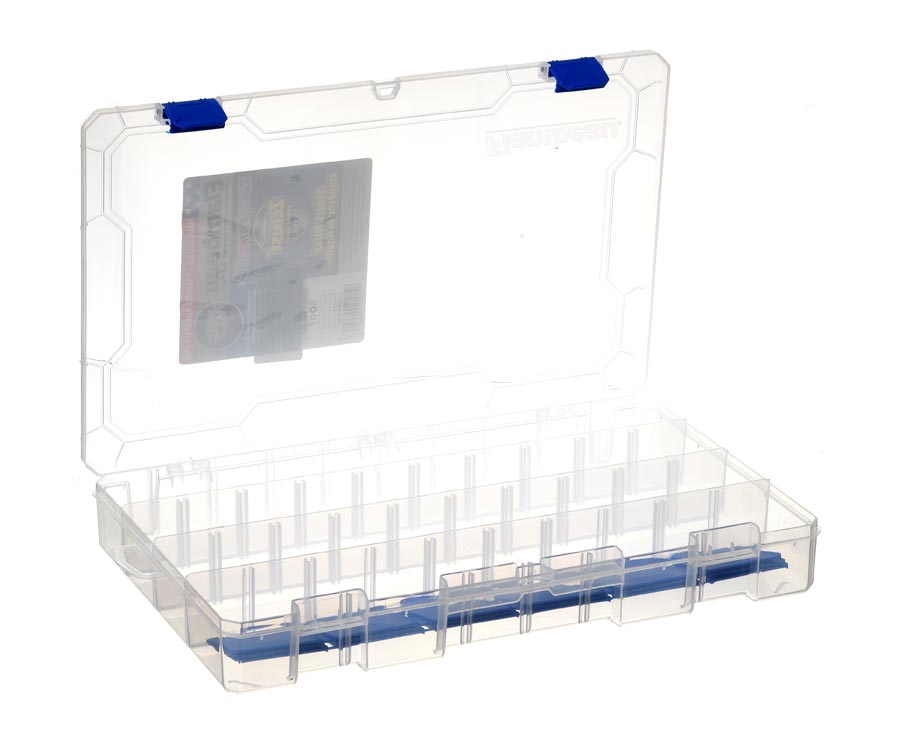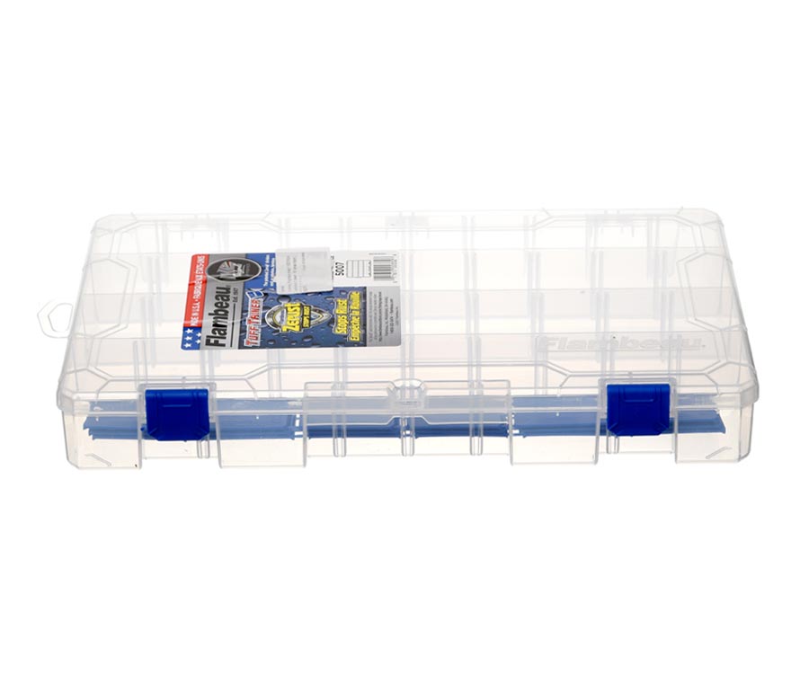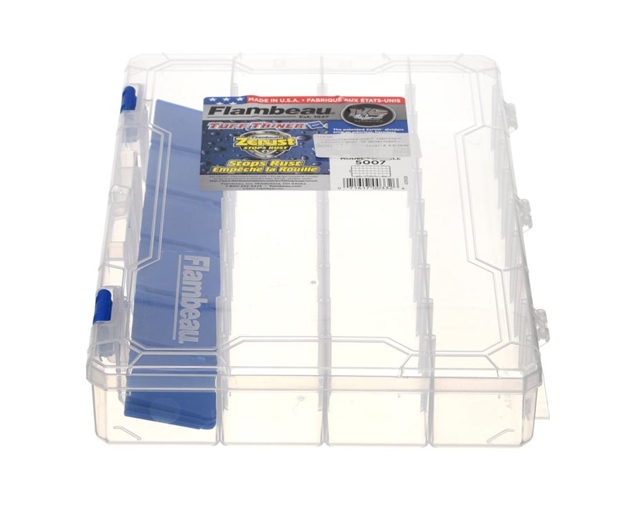 Риболовну коробку Flambeau Tuff Tainer 5007 Divided створено для зберігання приманок та аксесуарів. Коробку Flambeau 5007 виготовлено з високоміцного прозорого пластику, а для виготовлення перегородок Tuff Tainers виробник використовує технологію із застосуванням полімеру Zerust, що дає змогу уникнути утворення корозії та іржі на будь-яких металевих деталях. Внутрішній простір можна розділити на 36 відділення за допомогою 18 знімних перегородок, що забезпечить раціональне розміщення вмісту вашої коробки.