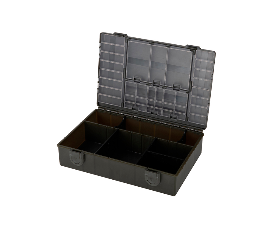 Основа Tackle Box була розроблена для розміщення всіх нових стандартних та XL внутрішніх відсіків, регульованих відсіків, коробок для гачків, а також оригінальних тримачів лідерів у стандарті та XL. Коробка має 3 довгі, 2 короткі і 1 середній роздільник, які є знімними і відокремлюють основу, що дозволяює налаштувати кращу конфігурацію. Відстань між розділовими прорізами була ретельно продумана, щоб максимально використовувати доступний простір, гарантуючи, що внутрішні ящики відсіків не деренчать в порожньому просторі і ефективно утримувати всі види повідцевих матеріалів. Усе, від інструментів для оснащення та стандартних шпулек з повідцем, до великих шпулек з повідцем, ідеально поміститься в цю коробку.
