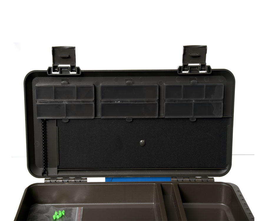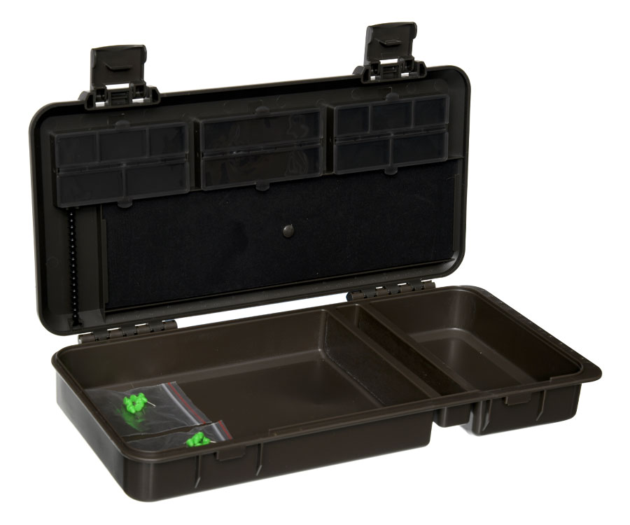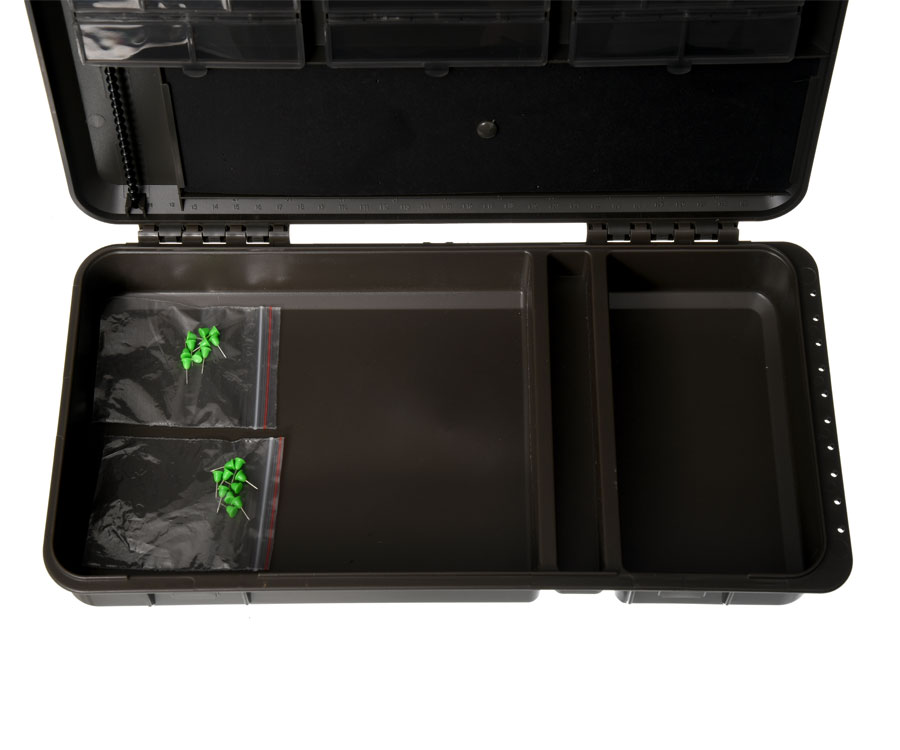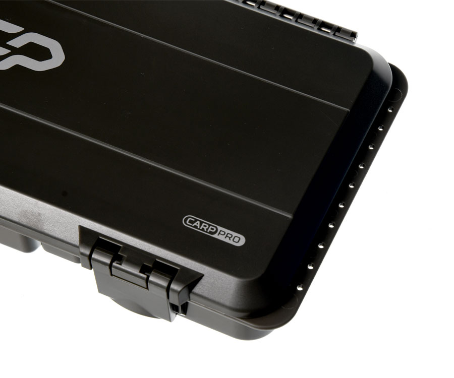 Коробка коропова Carp Pro Medium Tackle & Rig Box – двосторонній пластиковий кейс-органайзер, створений спеціально для зберігання і транспортування готових монтажів, комплектуючих до оснасток, термінальних снастей та аксесуарів, які використовуються в короповій ловлі. Набір складається з кейса, у верхній частині якого розташовано 6 відділень, що закриваються прозорими кришками, з 1, 2 і 3 відсіками для риболовних дрібничок, та повідочниця, яка дає змогу зберігати готові повідці різної довжини. У нижній частині розташовано три великі відсіки, призначені для зберігання грузил, годівниць, більших снастей та аксесуарів. Коробку-органайзер Carp Pro Medium Tackle & Rig Box виготовлено з міцного якісного ABS-пластику, що не втрачає своїх властивостей із часом, та обладнано потужними защібками й надійними петлями. Розміри: 34,5х17,5х5,5 см.