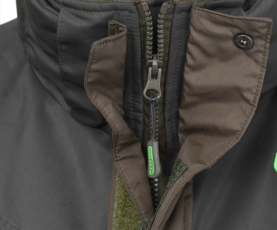 Куртку костюма Carp Pro Warm Suit виконано в сучасному стильному дизайні Carp Pro. Вона має надійну основну блискавку, яку прикриває клапан на липучках. У куртці з боків є дві зовнішні утеплені кишені з блискавками й одна внутрішня кишеня на липучці – для цінних речей та документів. Краї рукавів мають утяжки на липучці. Передбачено зручне утягування низу куртки. Високий зручний комір куртки вдало поєднується з глибоким капюшоном на підкладці, який чудово захищає від вітру та водяних бризок. Передбачено регулювання капюшону на липучці в потиличній частині та затяжки-фіксатори з боків.
