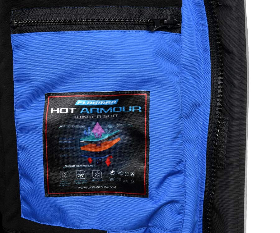 Flagman Hot Armour Winter Suit - теплий мембранний костюм, призначений для зимової риболовлі. Складається з куртки і напівкомбінезона, зовнішній шар яких виконаний з водонепроникного мембранного матеріалу Hi Pora. За збереження тепла в костюмі відповідає утеплювач Hollowsoft. Також костюм посилений накладками підвищеної міцності Oxford 180, які захищають Hot Armour Winter Suit від протирання в районі колін, сідниці і внутрішньої частини штанин. Внутрішня підкладка з м'якого мікрофлісу прекрасно зберігає тепло тіла, при цьому абсолютно не перешкоджаючи випаровуванню вологи що утворилася. Всі шви костюма герметично проклеєні.Підклад куртки зонований - поличка і спинка закриті легким мікрофлісом, а поділ виконаний з віскозної підкладки, яка виключає скупчення снігу і льоду на його внутрішній стороні. Куртка оснащена чотирма зовнішніми кишенями, утепленими флісовою підкладкою: верхні - врізні кишені, нижні - накладні з клапанами на липучках, які мають два відсіки. Внутрішня нагрудна кишеня - на блискавці. Куртка застібається на блискавку з подвійним зіпером, яку від дощу і снігу захищає подвійний клапан на липучці і кнопках. Внутрішній манжет рукавів виконаний з м'якого і теплого дов'язу, який виключає попадання снігу в рукава, а зовнішній манжет забезпечений утяжкою на липучці, що дозволяє відрегулювати і затягнути манжет по зап'ястку або рукавичці. Також передбачені: зручний високий комір, що відстібається, глибокий капюшон, що регулюється по висоті і об'єму, а також фіксують утяжки поясу і подолу куртки.Комбінезон оснащений високою спинкою і має дві бічні кишені, що закриваються на водонепроникні блискавки. Для щільної фіксації комбінезона на тілі в районі пояса вшита еластична резинка, також передбачені шлевки для ременя. Центральна блискавка комбінезона забезпечена подвійним зіпером і захисним клапаном. Еластичні підтяжки легко регулюються по висоті. Як і у всіх костюмах Флагман в колошах встановлена щільна снігозахисна спідниця. Коліна, сідниці і внутрішня частина штанин посилені додатковими накладками. На колінах передбачена кишеня для розміщення додаткових м'яких захисних щитків, які можна вставити або зняти на розсуд рибалки. Брючини від коліна до краю оснащені блискавкою - вона дозволяє збільшити діаметр штанин і натягнути штани практично на будь-який чобіт. Блискавки прикриті захисними клапанами.Характеристики костюма Flagman Hot Armour Winter Suit:- Легкий, теплий, практичний костюм для зимової риболовлі з температурним режимом до -20 ° С- Яскраві кольори куртки і світловідбиваючими елементи для кращої ідентифікації рибалки на льоду- Зовнішній шар з високоякісної мембранної тканини.- Водонепроникність: 8000 мм водяного стовпа- Дихаюча здатність: 3000 г / м² за 24 години- Утеплювач не втрачає форму.