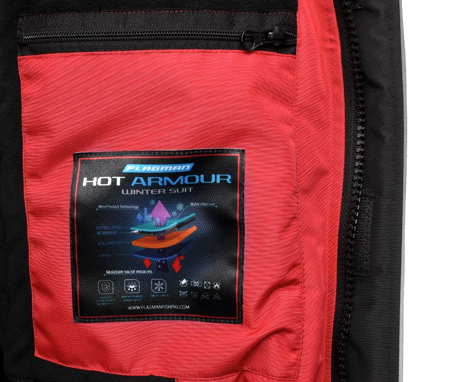 Flagman Hot Armour Winter Suit - теплий мембранний костюм, призначений для зимової риболовлі. Складається з куртки і напівкомбінезона, зовнішній шар яких виконаний з водонепроникного мембранного матеріалу Hi Pora. За збереження тепла в костюмі відповідає утеплювач Hollowsoft. Також костюм посилений накладками підвищеної міцності Oxford 180, які захищають Hot Armour Winter Suit від протирання в районі колін, сідниці і внутрішньої частини штанин. Внутрішня підкладка з м'якого мікрофлісу прекрасно зберігає тепло тіла, при цьому абсолютно не перешкоджаючи випаровуванню вологи що утворилася. Всі шви костюма герметично проклеєні.Підклад куртки зонований - поличка і спинка закриті легким мікрофлісом, а поділ виконаний з віскозної підкладки, яка виключає скупчення снігу і льоду на його внутрішній стороні. Куртка оснащена чотирма зовнішніми кишенями, утепленими флісовою підкладкою: верхні - врізні кишені, нижні - накладні з клапанами на липучках, які мають два відсіки. Внутрішня нагрудна кишеня - на блискавці. Куртка застібається на блискавку з подвійним зіпером, яку від дощу і снігу захищає подвійний клапан на липучці і кнопках. Внутрішній манжет рукавів виконаний з м'якого і теплого дов'язу, який виключає попадання снігу в рукава, а зовнішній манжет забезпечений утяжкою на липучці, що дозволяє відрегулювати і затягнути манжет по зап'ястку або рукавичці. Також передбачені: зручний високий комір, що відстібається, глибокий капюшон, що регулюється по висоті і об'єму, а також фіксують утяжки поясу і подолу куртки.Комбінезон оснащений високою спинкою і має дві бічні кишені, що закриваються на водонепроникні блискавки. Для щільної фіксації комбінезона на тілі в районі пояса вшита еластична резинка, також передбачені шлевки для ременя. Центральна блискавка комбінезона забезпечена подвійним зіпером і захисним клапаном. Еластичні підтяжки легко регулюються по висоті. Як і у всіх костюмах Флагман в колошах встановлена ​​щільна снігозахисна спідниця. Коліна, сідниці і внутрішня частина штанин посилені додатковими накладками. На колінах передбачена кишеня для розміщення додаткових м'яких захисних щитків, які можна вставити або зняти на розсуд рибалки. Брючини від коліна до краю оснащені блискавкою - вона дозволяє збільшити діаметр штанин і натягнути штани практично на будь-який чобіт. Блискавки прикриті захисними клапанами.Характеристики костюма Flagman Hot Armour Winter Suit:- Легкий, теплий, практичний костюм для зимової риболовлі з температурним режимом до -20 ° С- Яскраві кольори куртки і світловідбиваючими елементи для кращої ідентифікації рибалки на льоду- Зовнішній шар з високоякісної мембранної тканини.- Водонепроникність: 8000 мм водяного стовпа- Дихаюча здатність: 3000 г / м² за 24 години- Утеплювач не втрачає форму.