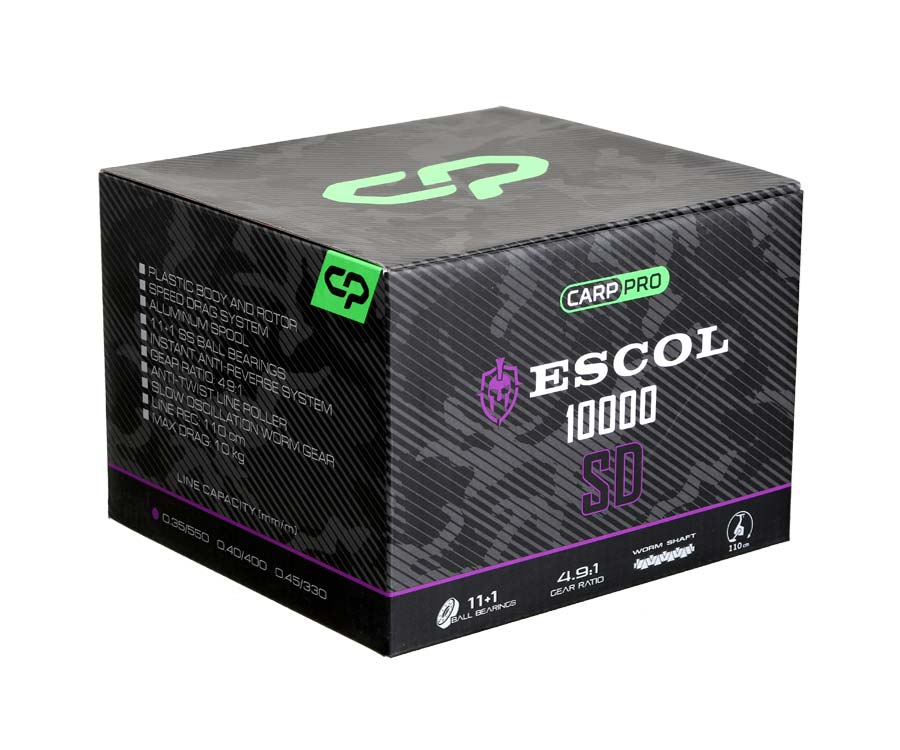 Carp Pro Escol – новинка 2023 року! Оновлена серія коропових котушок високого класу для ловлі трофейної риби на максимальних дистанціях. Котушки Carp Pro Escol нової генерації стали ще надійнішими, ефективнішими та зручнішими в роботі! Їхні великі алюмінієві шпулі геометрії Long Cast дають змогу помітно збільшити дальність закидання, порівняно зі снастями традиційної концепції. Зниженню тертя і підвищенню дальності закидання також сприяє конічна форма буртика шпулі. Ідеальне укладання жилки забезпечує нескінченний гвинт із малим кроком, що робить зворотно-поступальні рухи шпулі повільними. Укладання відбувається практично виток до витка, ще акуратніше й щільніше, що максимально знижує тертя жилки під час закидання та позитивно впливає на його дальність. Під шпулею Carp Pro Escol розташовано спеціальне кільце на трьох опорах, виступи якого входять у пази, які розміщено на внутрішній поверхні ротора. Це не дає жильці потрапити під шпулю та намотатися на вісь. До переваг нових котушок Carp Pro Escol варто також додати міцну алюмінієву ручку з обгумованим аерокнобом, яка вкручується в головну пару, мінімізуючи люфти в цьому вузлі, потужний тяговий механізм, нітрид-титанове покриття ролика укладача жилки із системою Anti-Twist, що унеможливлює перекручування жилки, миттєвий стопор зворотного ходу, підвищену кількість жилки, що намотується за один оберт ручки, а також швидкий фрикціон, який дає змогу миттєво змінювати гальмівне зусилля, вирізняється високою стабільністю роботи та не підведе в найвідповідальніший момент. Carp Pro Escol – це надійний робочий інструмент для мисливців на трофейного коропа!
