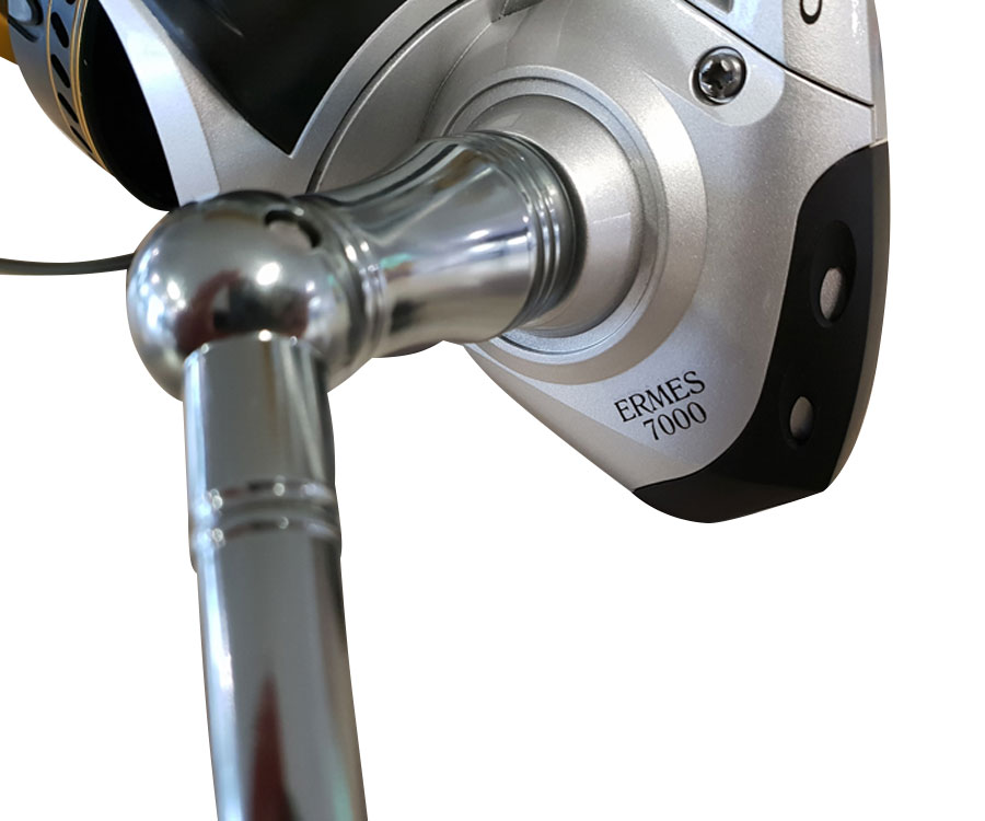 Colmic Ermes 7000 – потужна й дуже надійна котушка 7000 розміру з мінімалістичним дизайном. Вона ідеально підходить для сьорф-кастингу, а також може стати надійним інструментом при полюванні на великих прісноводних хижаків. Корпус і ротор котушки Ermes 7000 виготовлено з надлегкого матеріалу на основі карбону. Вони прекрасно поєднуються з полегшеною алюмінієвою шпулею, що значно знижує вагу котушки. Потужний і надійний фрикціон дозволяє виконувати точне та своєчасне регулювання гальмівного зусилля котушки, що дає можливість швидко адаптуватися до будь-яких умов риболовлі. У прекрасно збалансованому механізмі котушки встановлено 8+1 високоякісних підшипників із нержавіючої сталі, які захищено від корозії. Головну шестерню виготовлено з латуні, що значно подовжує термін її служби. Завдяки шпулі великого діаметра, її формі й рівномірному намотуванню жилки забезпечується максимально легке сходження жилки зі шпулі, що дозволяє робити надзвичайно далекі й точні закидання. Усі компоненти котушки пройшли спеціальну обробку, яка захищає їх від корозії.