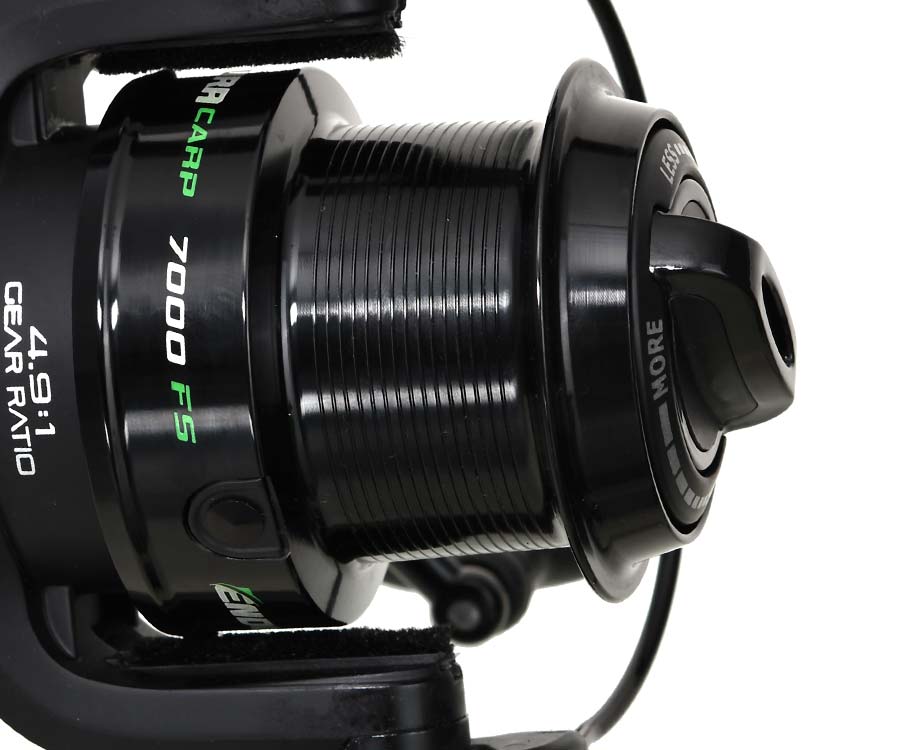 Flagman Endura Carp FS – серія потужних котушок для ловлі коропа, які призначені для далеких закидань і силового виважування великої риби. Алюмінієва шпуля великого розміру з конічним буртиком і використання в механізмі нескінченного гвинта Worm Shaft System, що забезпечує винятково якісне укладання жилки – усе це незмінні атрибути котушок для далеких і точних закидань. Flagman Endura Carp FS оснащені системою Free Spool, що гарантує безперешкодне змотування жилки під час покльовки риби та миттєве ввімкнення механізму переднього фрикціону, щойно риболов почне обертати ручку. Плавний хід механізму котушки Flagman Endura Carp забезпечують 7+1 якісних кулькових підшипників, які встановлені в найнеобхідніших місцях тягового механізму. Точену алюмінієву ручку оснащено зручним гумовим кнобом, що комфортно лежить у руці та має гумове покриття, яке не дає змоги кнобу прослизати навіть у мокрій руці. Додайте сюди точно налаштовуваний фрикціон, відмінне динамічне балансування, підпружинену металеву кліпсу, ролик укладача жилки Anti-Twist, стильний чорний дизайн – й отримаємо котушку, яка підійде для будь-яких умов коропової риболовлі з прицілом на ловлю трофейної риби.