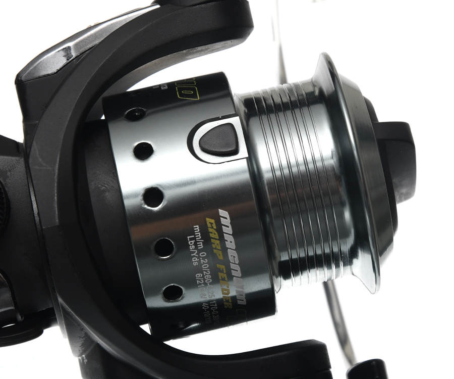 Flagman Magnum CARP Feeder 4000 – новинка 2024 року, доступна широкому колу рибалок котушка, що підійде як для фідерної, так і для класичної коропової ловлі. Котушку Flagman Magnum Carp Feeder 4000 виготовлено в корпусі з високоміцного пластику, а її надійний тяговий механізм із редукцією 5,2:1 зібрано на трьох кулькових підшипниках. Ємність полегшеної алюмінієвої шпулі Magnum Carp Feeder 4000 оптимізовано для роботи з тонкими сучасними жилками і шнурами. Шпулю оснащено круглою підпружиненою металевою кліпсою, яка робить фіксацію дистанції ловлі надійною та безпечною як для жилки, так і для шнура. Конічний V-подібний буртик шпулі значно зменшує тертя під час сходу жилки, що підвищує дальність закидання. Передній фрикціон забезпечує винятково точне налаштування гальмівного зусилля, а система Free Spool котушки Flagman Magnum Carp Feeder 4000 гарантує безперешкодне стравлювання жилки під час клювання риби будь-якого розміру та миттєве ввімкнення фрикційного гальма в момент початку обертання рукояті.