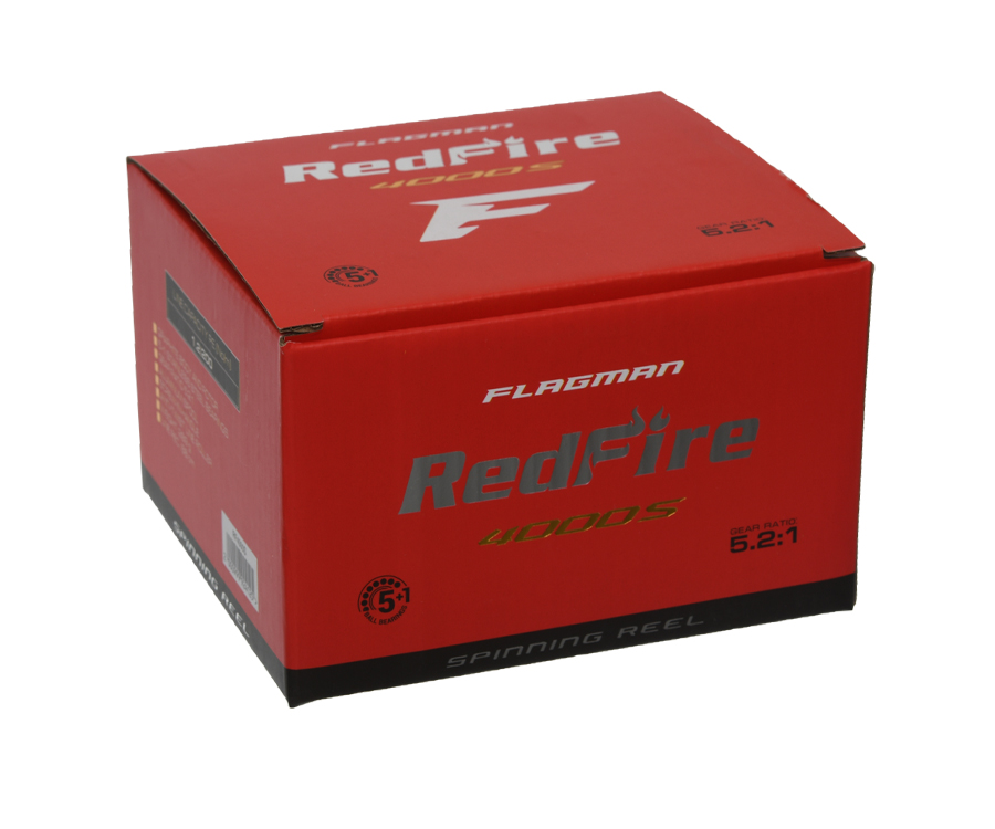 Flagman RedFire – новинка сезону, серія універсальних спінінгових котушок для широкого кола риболовів, що вирізняються стильним дизайном і чудовими технічними характеристиками. У прекрасно збалансованому механізмі, розміщеному в жорсткому графітовому корпусі, використано 5 кулькових і 1 роликовий підшипник із нержавіючої сталі, завдяки чому котушка Flagman RedFire має плавний хід і гарні тягові характеристики. Усі котушки серії оснащені низькопрофільними алюмінієвими шпулями з конічним буртиком, мають ролик жилковкладача із системою Anti-Twist та оптимізовані під використання сучасних шнурів і жилок. Вдосконалений кулісний механізм забезпечує якісне укладання жилки, що підвищує дальність і точність закидань. На окрему увагу заслуговує система Screw-in-handle, за якої алюмінієва ручка котушки вкручується безпосередньо в головну шестерню. Це позитивно позначається на відчутті збитості механізму та загальній надійності. Кноб добре лягає в руку й має зручну форму. Плавне регулювання фрикціону дає змогу максимально точно встановити необхідне гальмівне зусилля. Серія котушок Flagman RedFire має чотири моделі в різних розмірах із яскравим дизайном. Якщо RedFire 2000S – це чудовий вибір для ловлі на легкі приманки, то модель RedFire 4000S впорається як із ривковими анімаціями воблерів big minnow, так і з джиговими приманками вагою до 40 г. RedFire – це котушки, які мають краще технічне оснащення та характеристики, ніж переважна більшість конкурентів у даній ціновій категорії, а їхній стильний дизайн одразу привертає увагу та підтверджує заслужене звання «Яскравий лідер сегмента».