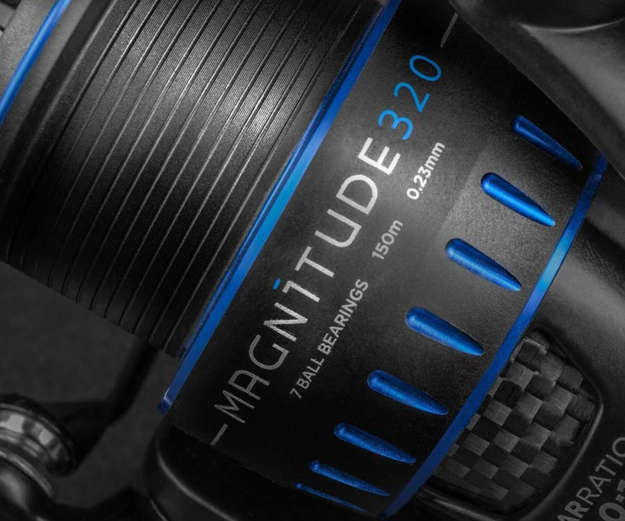 Preston Innovations Magnitude 320 Reel – безінерційна котушка, створена з урахуванням сучасних способів ловлі, незалежно від типу водойми, будь то природні ставки чи озера, комерційні водойми або ж річки. Модель розроблялася таким чином, аби задовольнити всі потреби риболова й без проблем впоратися з трофейною рибою. Основні переваги цієї котушки – екстремально компактний корпус, що працює в сукупності з надповільненими коливаннями штока черв'ячного механізму, який забезпечує неймовірну потужність підмотування для такого розміру корпусу, і водночас ідеальну укладку жилки на велику низькопрофільну шпулю, яка допускає роботу з тонкими шнурами та жилками без підмотування бекінга. Передавальне число механізму становить 5.0:1 – прекрасний компроміс між тягою і швидкістю підмотування, коли практикується швидкісна ловля. Шпуля котушки Preston Magnitude 320 Reel виготовлена з алюмінію, її передній буртик має напилення з нітриду титану. На шпулі встановлено 2 круглих безпечних кліпси, що дають змогу фіксувати дві дистанції ловлі одночасно. Модель виконано в 3000-му розмірі, вона підійде для пікерних і легких фідерних снастей, а також інших способів ловлі, які не передбачають використання важких оснасток – болонська чи матчева снасть, спінінг.